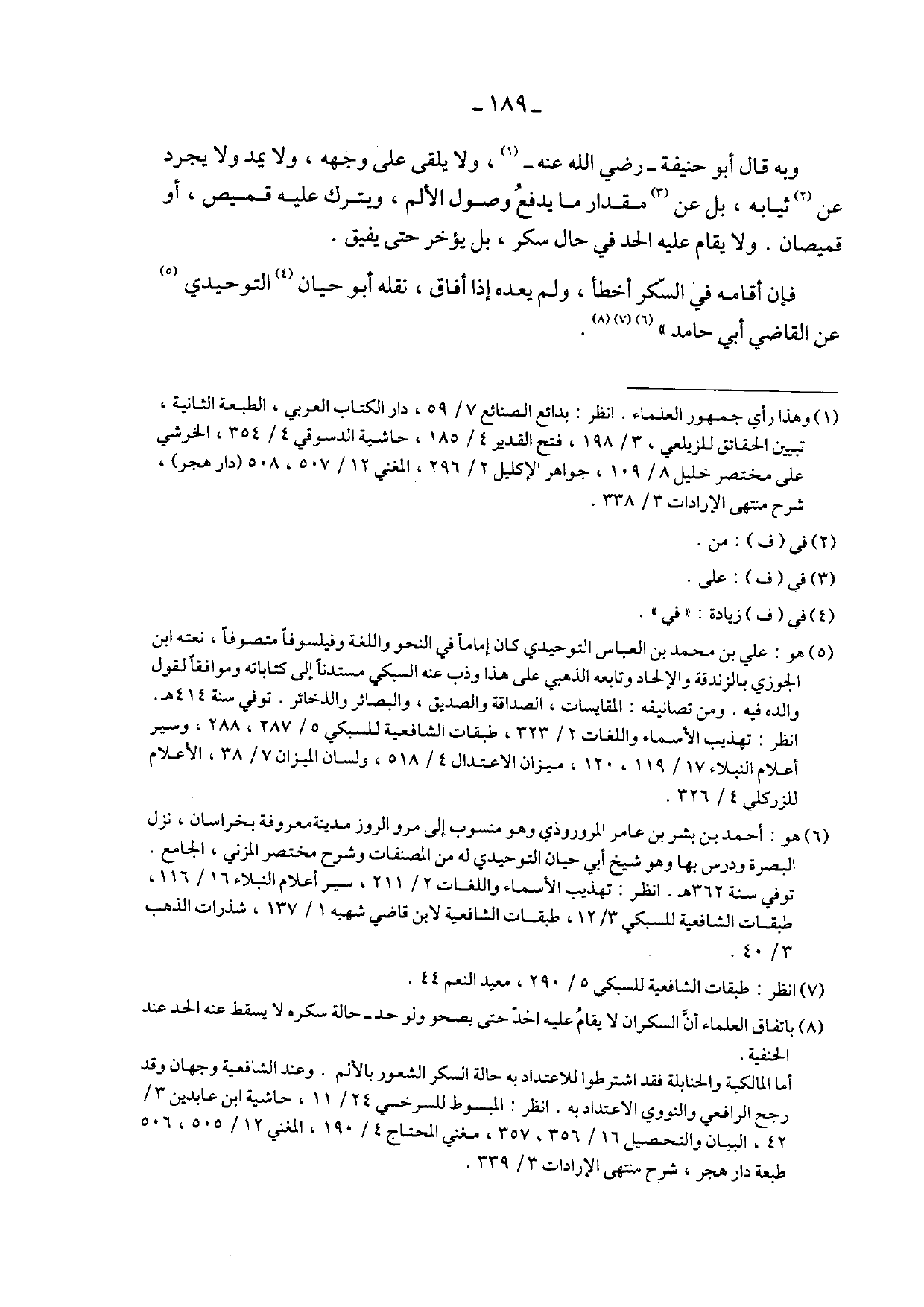 وبه قال أبو حنيفة - رضي الله عنه -، ولا يلقى على وجهه، ولا يمد ولا يجرد عن ثيابه، بل عن مقدار ما يدفع وصول الألم، ويترك عليه قميص، أو قميصان. ولا يقام عليه الحد في حال سكر، بل يؤخر حتى يفيق.
