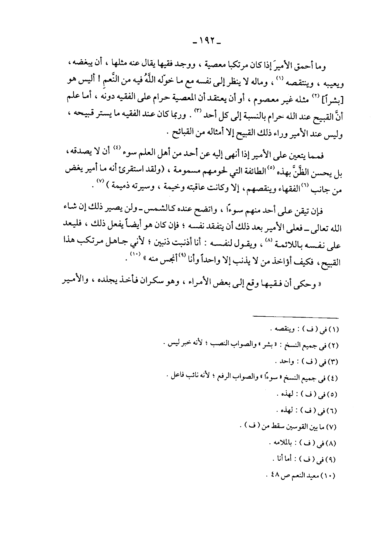 وما أحمق الأمير إذا كان مرتكباً معصية، ووجد فقيها يقال عنه مثلها، أن يبغضه، ويعيبه، وينتقصه، وماله لا ينظر إلى نفسه مع ما خوله الله فيه من النعم! أليس هو [بشراً] مثله غير معصوم، أو أن يعتقد أن المعصية حرام على الفقيه دونه، أما علم أن القبيح عند الله حرام بالنسبة إلى كل أحد. وربما كان الفقيه ما يستر قبيحه، وليس عند الأمير وراء ذلك القبيح إلا أمثاله من القبائح.