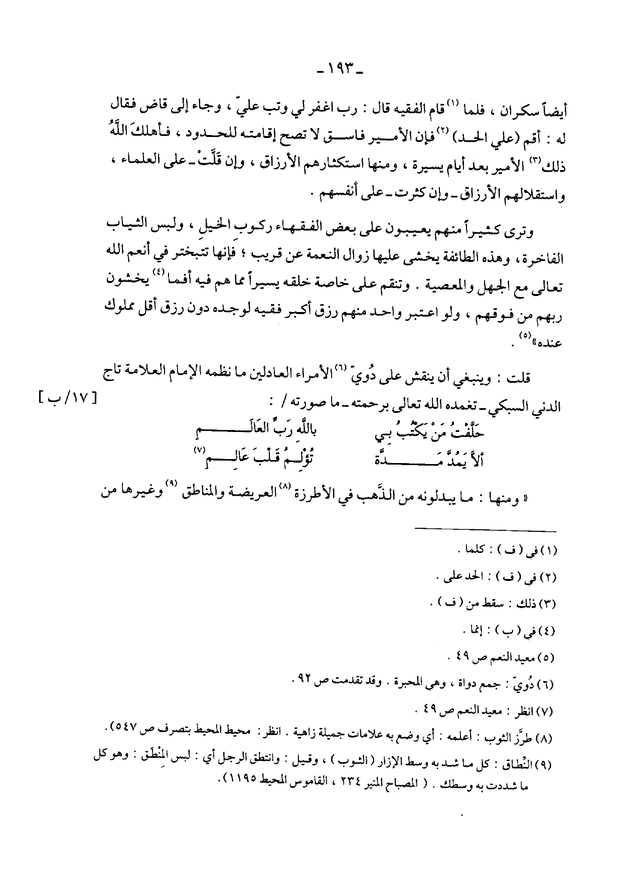 أيضاً سكران، فلما قام الفقيه قال: رب اغفر لي وتب علي، وجاء إلى قاض فقال له: أقم (علي الحد) فإن الأمير فاسق لا تصح إقامته للحدود، فأهلك الله ذلك الأمير بعد أيام يسيرة، ومنها استكثارهم الأرزاق، وإن قلت - على العلماء، واستقلالهم الأرزاق - وإن كثرت - على أنفسهم.