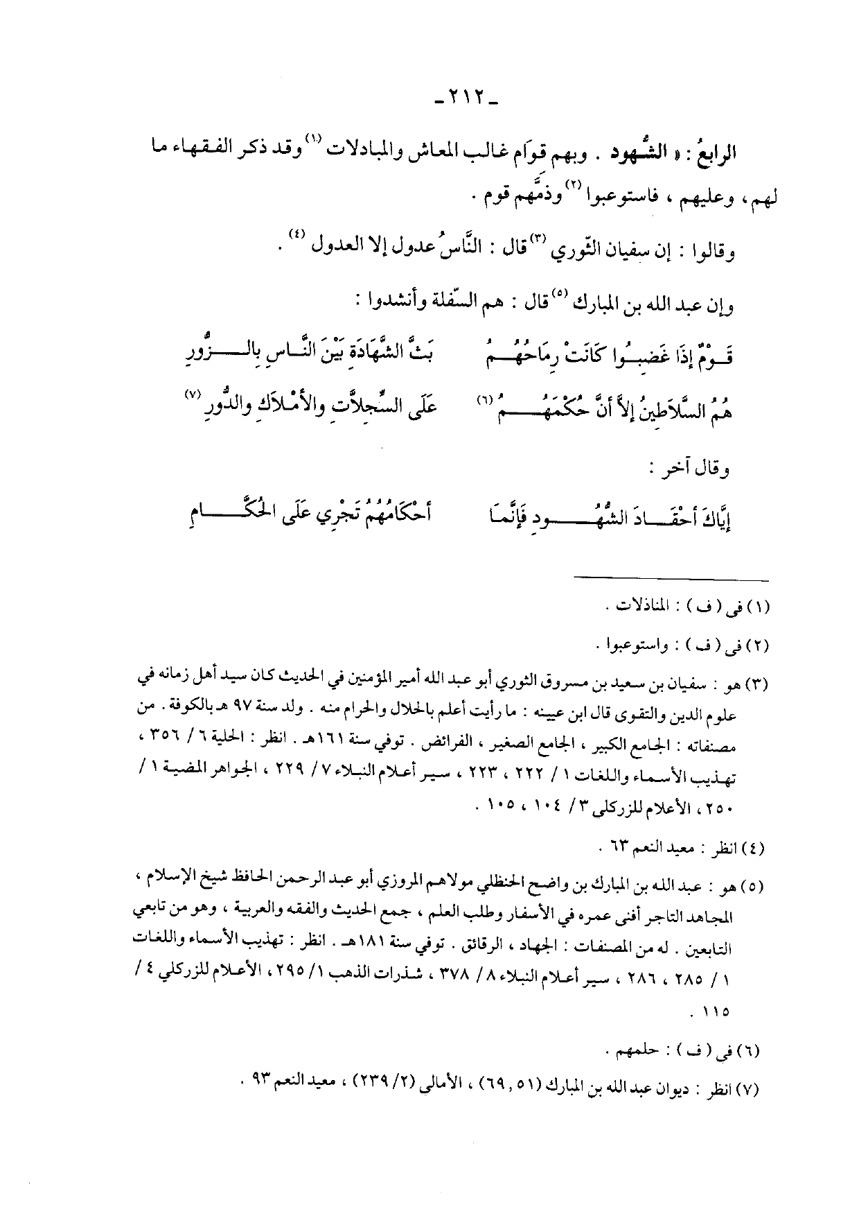 الرابع: "الشهود. وبهم قوام غالب المعاش والمبادلات وقد ذكر الفقهاء ما لهم، وعليهم، فاستوعبوا وذمهم قوم.