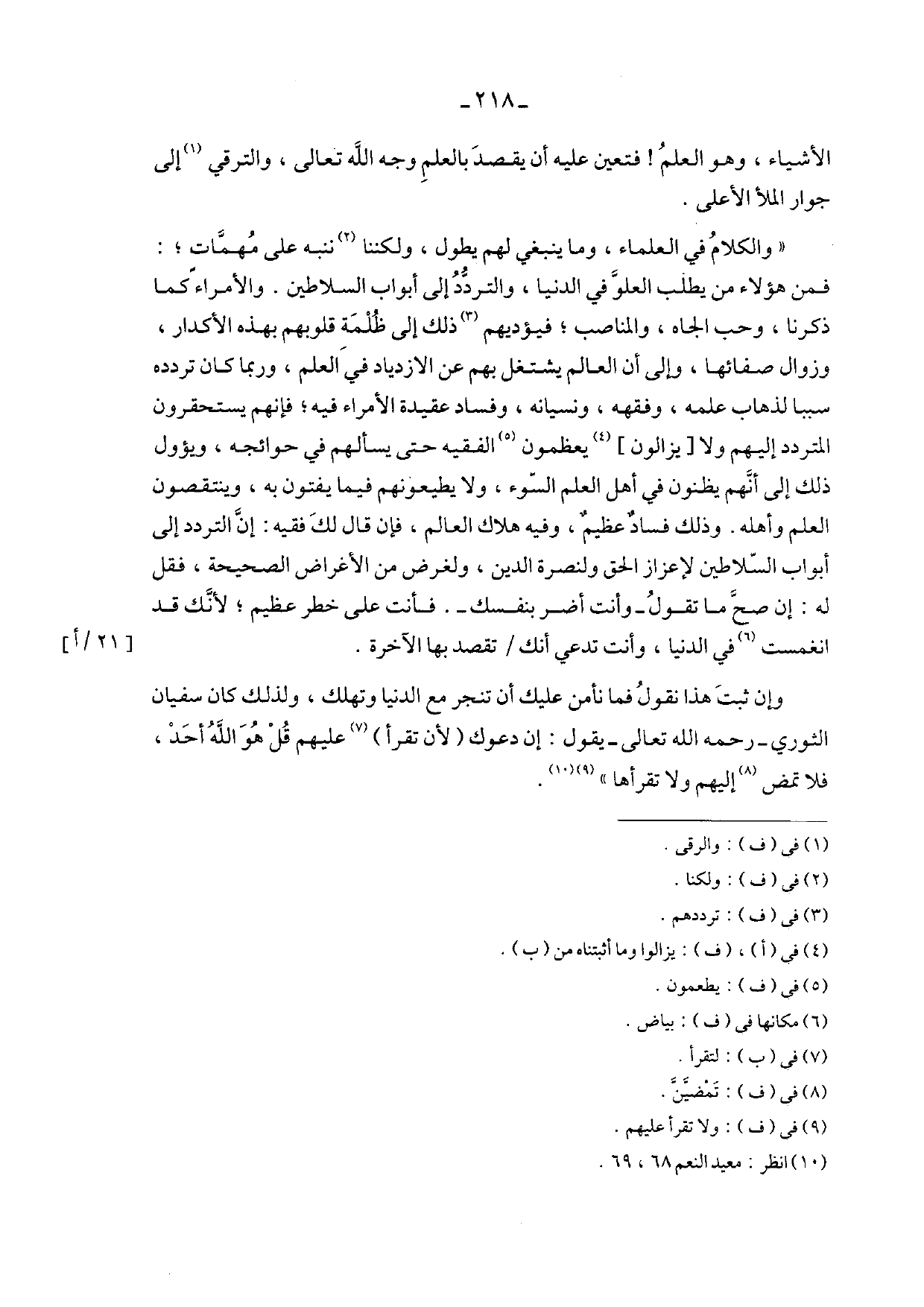 "والكلام في العلماء، وما ينبغي لهم يطول، ولكننا ننبه على مهمات؛ : فمن هؤلاء من يطلب العلو في الدنيا، والتردد إلى أبواب السلاطين. والأمراء كما ذكرنا، وحب الجاه، والمناصب؛ فيؤديهم ذلك إلى ظلمة قلوبهم بهذه الأكدار، وزوال صفائها، وإلى أن العالم يشتغل بهم عن الازدياد في العلم، وربما كان تردده سبباً لذهاب علمه، وفقهه، ونسيانه، وفساد عقيدة الأمراء فيه؛ فإنهم يستحقرون المتردد إليهم ولا [يزالون] يعظمون الفقيه حتى يسالهم في حوائجه، ويؤول ذلك إلى أنهم يظنون في أهل العلم السوء، ولا يطيعونهم فيما يفتون به، وينتقصون العلم وأهله. وذلك فساد عظيم، وفيه هلاك العالم، فإن قال لك فقيه: إن التردد إلى أبواب السلاطين لإعزاز الحق ولنصرة الدين، ولغرض من الأغراض الصحيحة، فقل له: إن صح ما تقول - وأنت أضر بنفسك -. فأنت على خطر عظيم؛ لأنك قد انغمست في الدنيا، وأنت تدعي أنك / تقصد بها الآخرة.