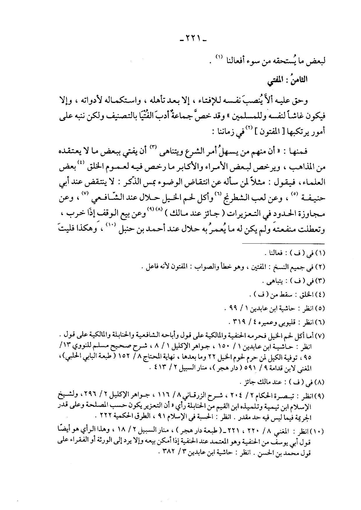 وحق عليه ألا ينصب نفسه للإفتاء، إلا بعد تأهله، واستكماله لأدواته، وإلا فيكون غاشاً لنفسه وللمسلمين" وقد خص جماعة أدب الفتيا بالتصنيف ولكن ننبه على أمور يرتكبها [المفتون] في زماننا: