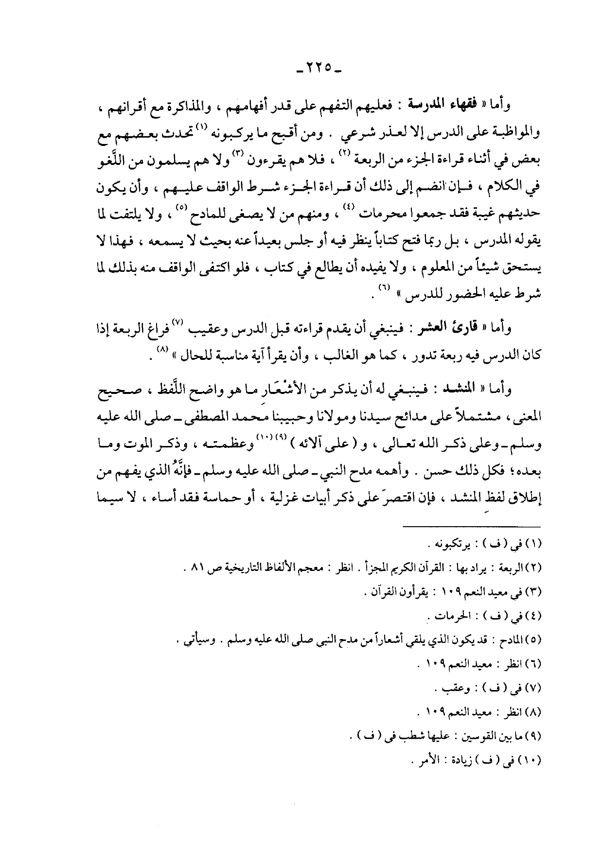 وأما "فقهاء المدرسة: فعليهم التفهم على قدر أفهامهم، والمذاكرة مع أقرانهم، والمواظبة على الدرس إلا لعذر شرعي. ومن أقبح ما يركبونه تحدث بعضهم مع بعض في أثناء قراءة الجزء من الربعة، فلا هم يقرءون ولا هم يسلمون من اللغو في الكلام، فإن انضم إلى ذلك أن قراءة الجزء شرط الواقف عليهم، وأن يكون حديثهم غيبة فقد جمعوا محرمات، ومنهم من لا يصغى للمادح، ولا يلتفت لما يقوله المدرس، بل ربما فتح كتاباً ينظر فيه أو جلس بعيداً عنه بحيث لا يسمعه، فهذا لا يستحق شيئاً من المعلوم، ولا يفيده أن يطالع في كتاب، فلو اكتفى الواقف منه بذلك لما شرط عليه الحضور للدرس".