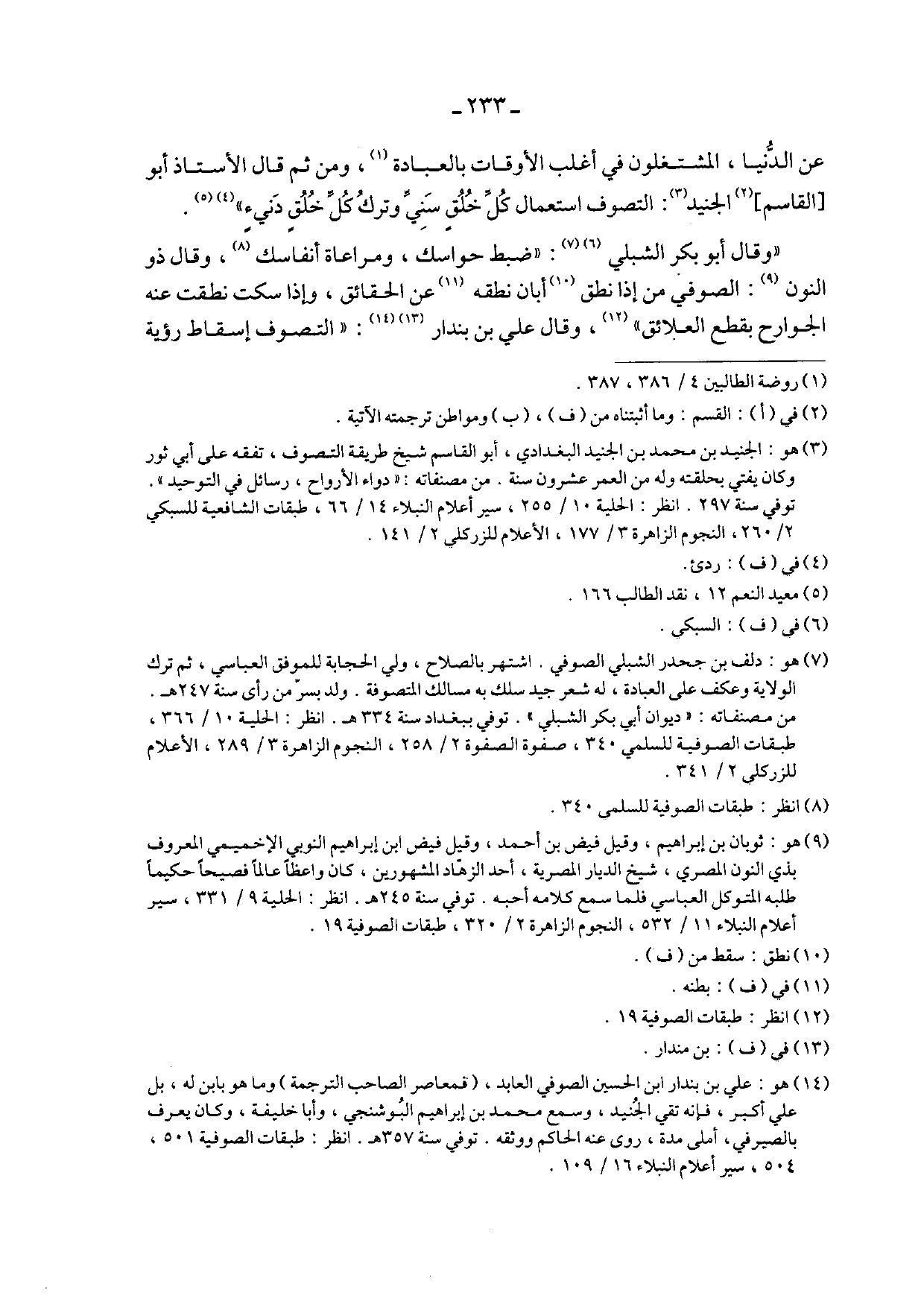 "وقال أبو بكر الشبلي: "ضبط حواسك، ومراعاة أنفاسك، وقال ذو النون: الصوفي من إذا نطق أبان نطقه عن الحقائق، وإذا سكت نطقت عنه الجوارح بقطع العلائق"، وقال علي بن بندار: "التصوف إسقاط رؤية.