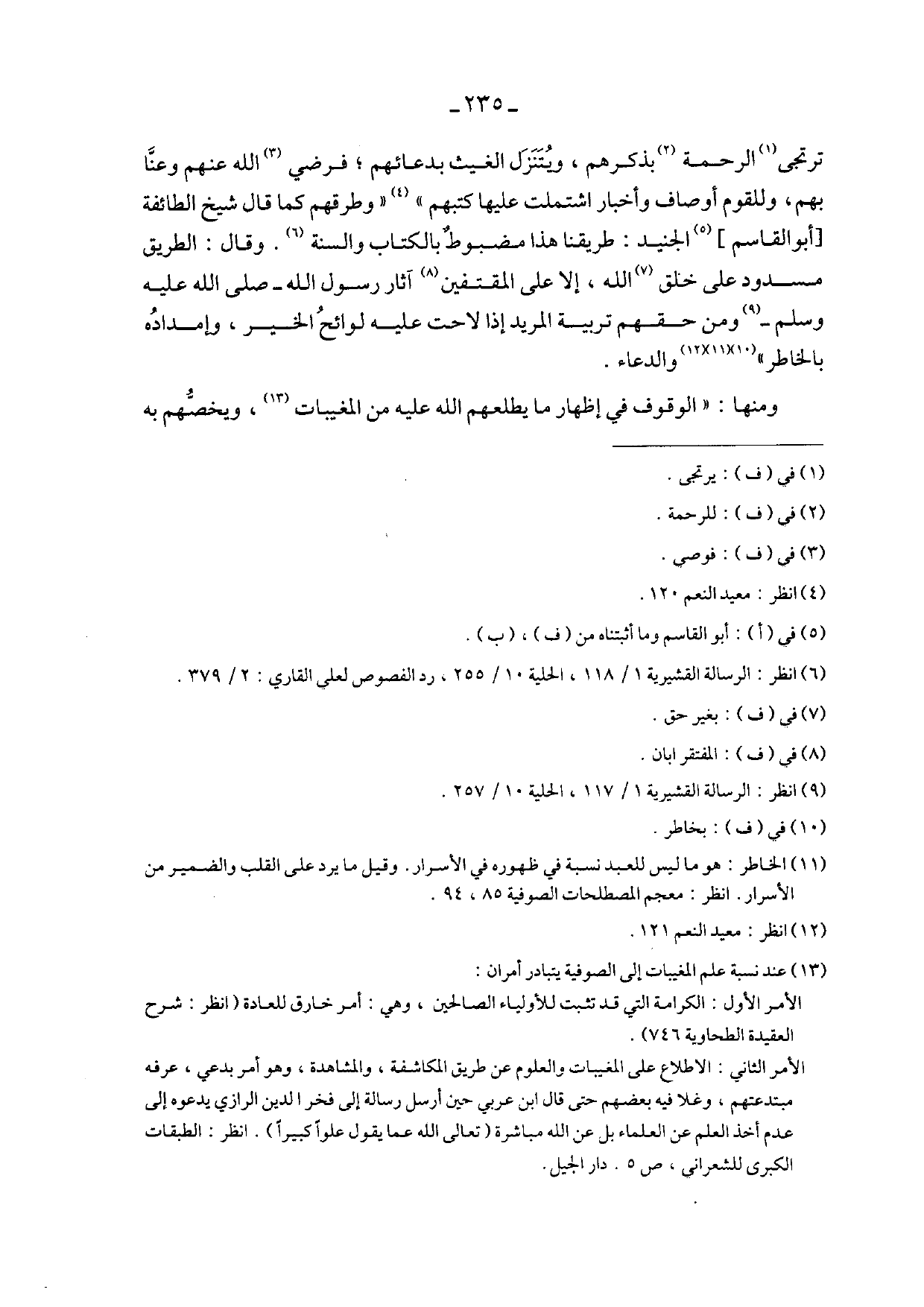 ترتجي الرحمة بذكرهم، ويتنزل الغيب بدعائهم؛ فرضي الله عنهم وعنا بهم، وللقوم أوصاف وأخبار اشتملت عليها كتبهم" "وطرقهم كما قال شيخ الطائفة [أبو القاسم] الجنيد: طريقنا هذا مظبوط بالكتاب والسنة. وقال: الطريق مسدود على خلق الله، إلا على المقتفين آثار رسول الله - صلى الله عليه وسلم - ومن حقهم تربية المريد إذا لاحت عليه لوائح الخير، وإمداده بالخاطر" والدعاء.