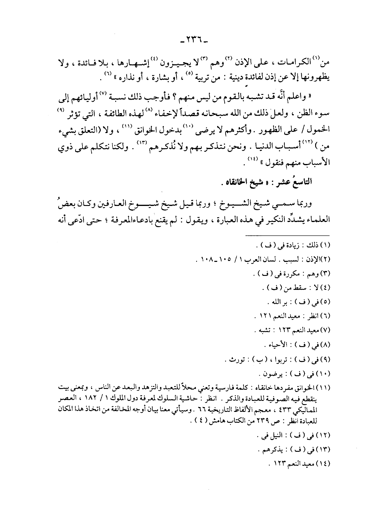 "واعلم أنه قد تشبه بالقوم من ليس منهم؟ فأوجب ذلك نسبة أوليائهم إلى سوء الظن، ولعل ذلك من الله سبحانه قصداً لإخفاء لهذه الطائفة، التي تؤثر الخمول / على الظهور. وأكثرهم لا يرضى بدخول الخوانق، ولا (التعلق بشيء من) أسباب الدنيا. ونحن نتذكر بهم ولا نذكرهم. ولكنا نتكلم على ذوي الأسباب منهم فنقول".