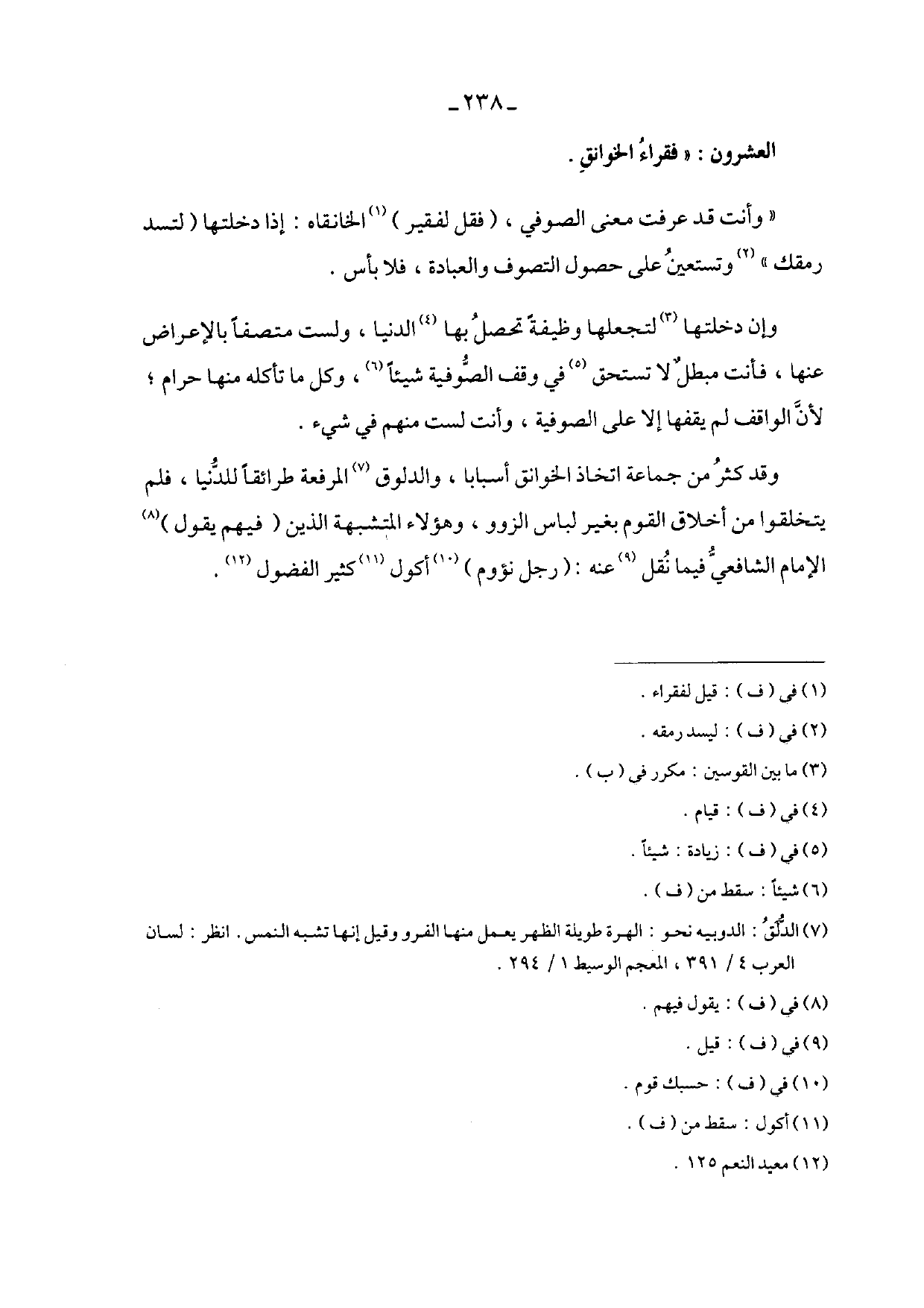 وقد كثر من جماعة اتخاذ الخوانق أسباباً، والدلوق المرفعة طرائقاً للدنيا، فلم يتخلقوا من أخلاق القوم بغير لباء الزوو، وهؤلاء المتشبهة الذين (فيهم يقول) الإمام الشافعي فيما نقل عنه: (رجل نؤوم) أكول كثير الفضول.
