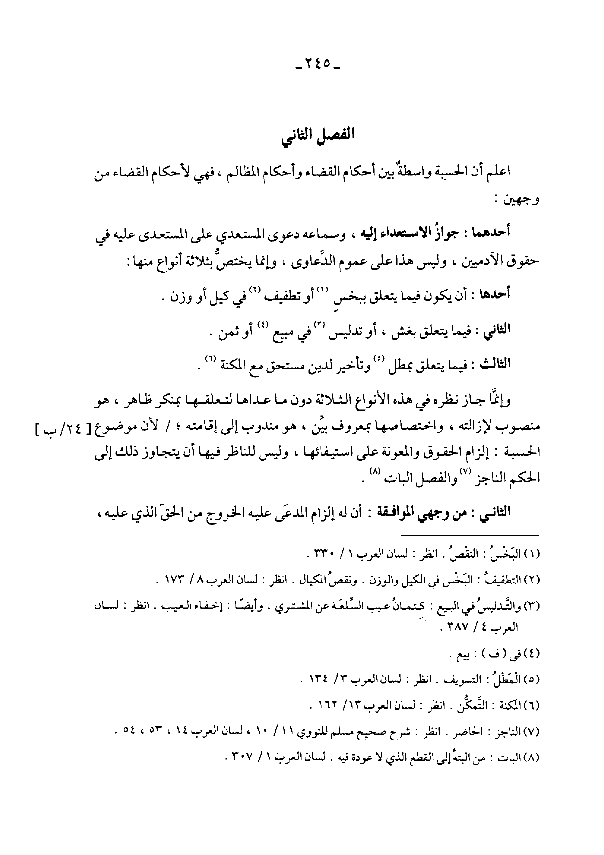 اعلم أن الحسبة واسطة بين أحكام القضاء وأحكام المظالم، فهي لأحكام القضاء من وجهين: