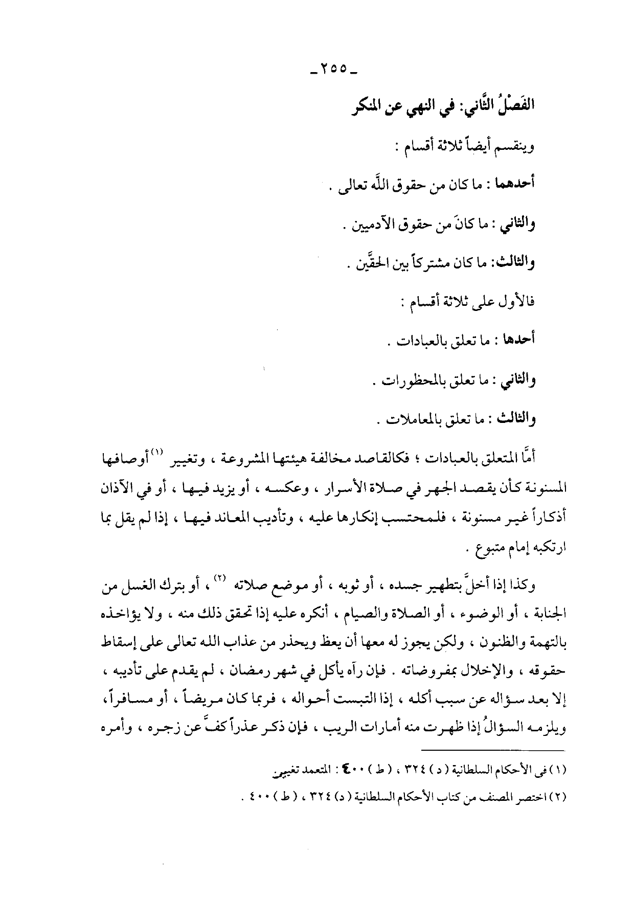 أما المتعلق بالعبادات؛ فكالقاصد مخالفة هيئتها المشروعة، وتغيير أوصافها المسنونة كأن يقصد الجهر في صلاة الأسرار، وعكسه، أو يزيد فيها، أو في الآذان أذكاراً غير مسنونة، فلمحتسب إنكارها عليه، وتأديب المعاند فيها، إذا لم يقل بما ارتكبه إمام متبوع.