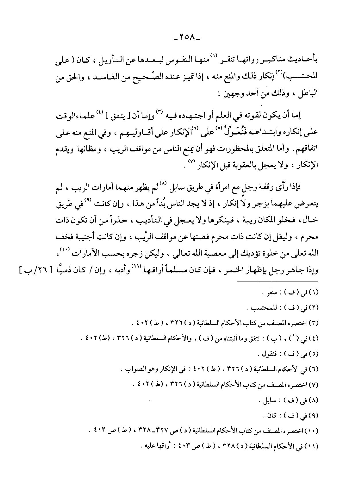إما أن يكون لقوته في العلم أو اجتهاده فيه وإما أن [يتفق] علماء الوقت على إنكاره وابتداعه فنعول على الإنكار على أقاوليهم، وفي المنع منه على اتفاقهم. وأما المتعلق بالمحظورات فهو أن يمنع الناس من مواقف الريب، ومظانها ويقدم الإنكار، ولا يعجل بالعقوبة قبل الإنكار.