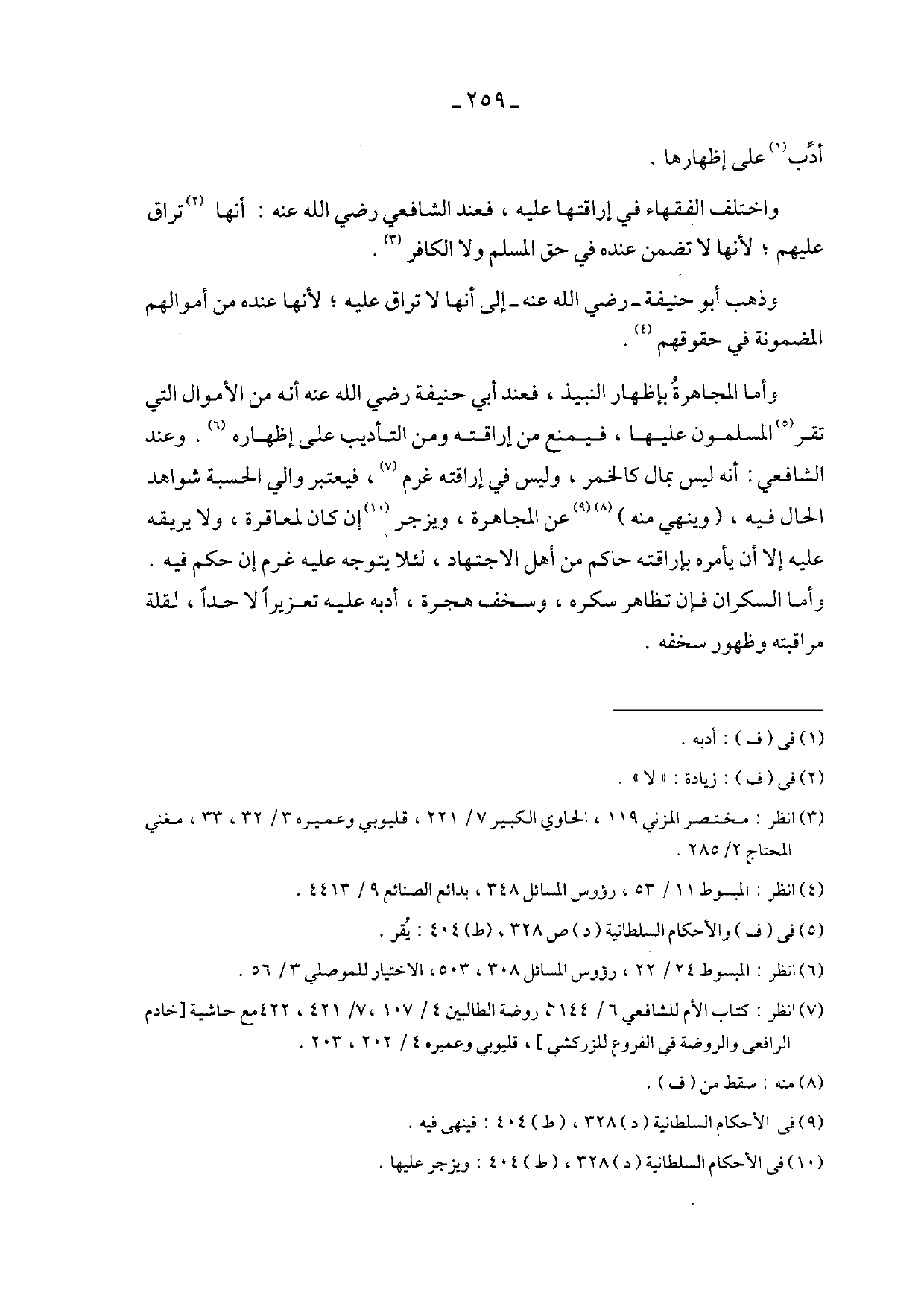 وأما المجاهرة بإظهار النبيذ، فعند أبي حنيفية رضي الله عنه أنه من الأموال التي تقر المسلمون عليها، فيمنع من إراقته ومن التأديب على إظهار. وعند الشافعي: أنه ليس بمال كالخمر، وليس في إراقته غرم، فيعتبر والي الحسبة شواهد الحال فيه، (وينهي منه) عن المجاهرة، ويزجر إن كان لمعاقرة، ولا يريقه عليه إلا أن يأمره بإراقته حاكم من أهل الاجتهاد، لئلا يتوجه عليه غرم إن حكم فيه. وأما السكران فإن تظاهر سكره، وسخف هجرة، أدبه عليه تعزيراً لا حداً، لقلة مراقبته وظهور سخفه.