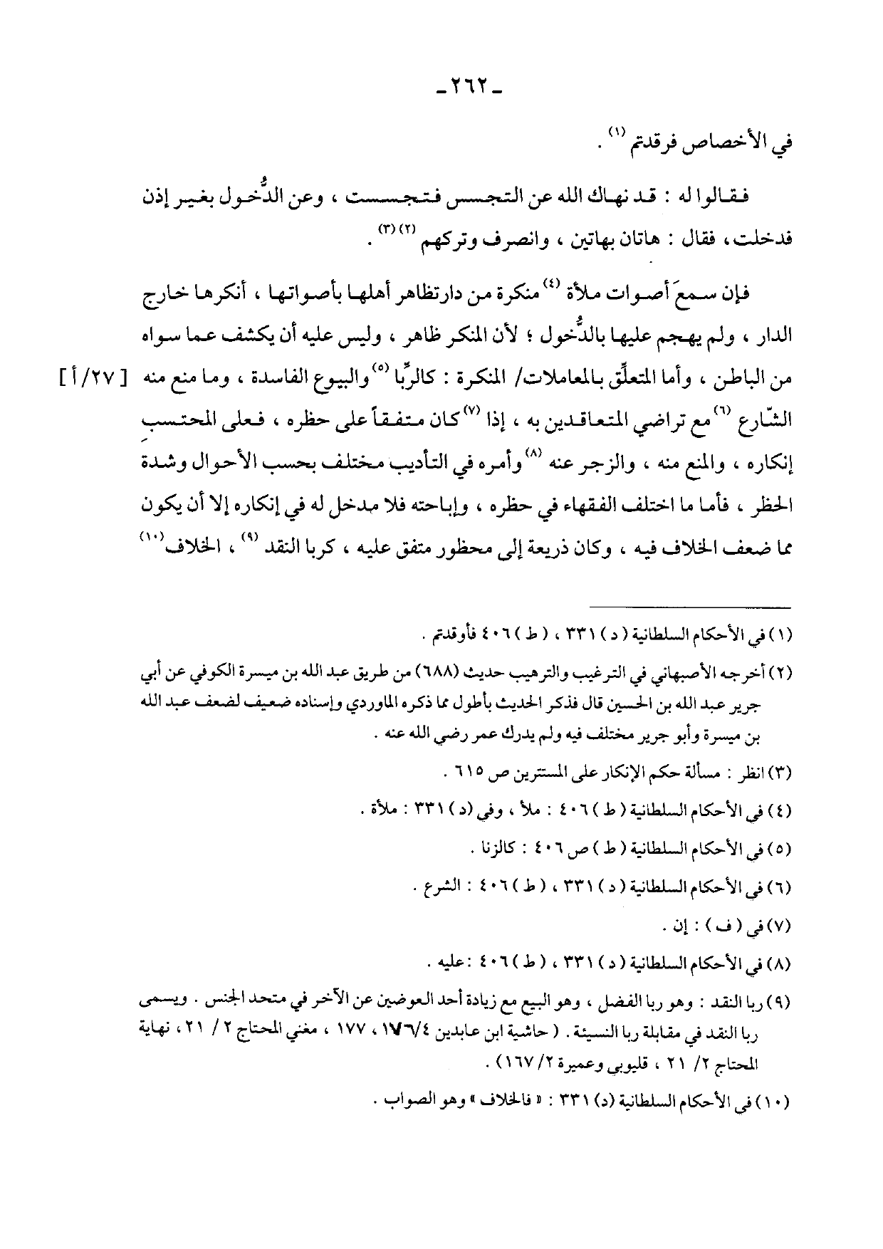 فإن سمع أصوات ملأة منكرة من دار تظاهر أهلها بأصواتها، أنكرها خارج الدار، ولم يهجم عليها بالدخول؛ لأن المنكر ظاهر، وليس عليه أن يكشف عما سواه من الباطن، وأما المتعلق بالمعاملات / المنكرة: كالربا والبيوع الفاسدة، وما منع منه الشارع مع تراضي المتعاقدين به، إذا كان متفقاً على حظره، فعلى المحتسب إنكاره، والمنع منه، والزجر عنه وأمره في التأديب مختلف بحسب الأحوال وشدة الحظر، فأما ما اختلف الفقهاء في حظره، وإباحته فلا مدخل له في إنكاره إلا أن يكون مما ضعف الخلاف فيه، وكان ذريعة إلى محظور متفق عليه، كربا النقد، الخلاف