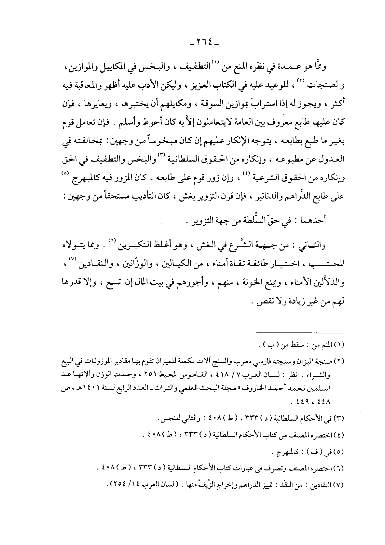 ومما هو عمدة في نظره المنع من التطفيف، والبخس في المكاييل والموازين، والصنجات، للوعيد عليه في الكتاب العزيز، وليكن الأدب عليه أظهر والمعاقبة فيه أكثر، ويجوز له إذا استراب بموازين السوقة، ومكايلهم أن يختبرها، ويعايرها، فإن كان عليها طابع معروف بين العامة لا يتعاملون إلا به كان أحوط وأسلم. فإن تعامل قوم بغير ما طبع بطابعه، يتوجه الإنكار عليهم إن كان مبخوساً من وجهين: بمخالفته في العدول عن مطبوعه، وإنكاره من الحقوق السلطانية والبخس والتطفيف في الحق وإنكاره من الحقوق الشرعية، وإن زور قوم على طابعه، كان المزور فيه كالمبهرج على طابع الدراهم والدنانير، فإن قرن التزوير بغش، كان التأديب مستحقاً من وجهين: