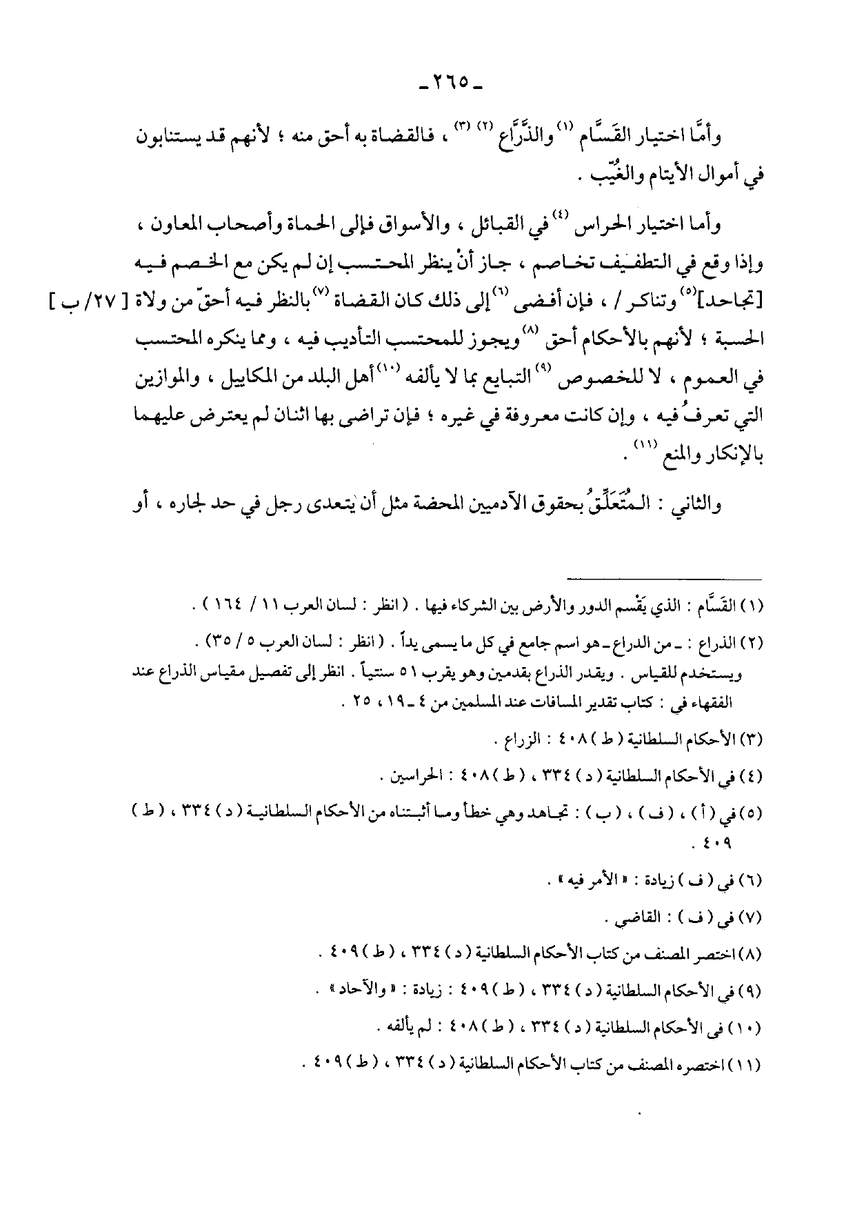 وأما اختيار الحراس في القبائل، والأسواق فإلى الحماة وأصحاب المعاون، وإذا وقع في التطفيف تخاصم، جاز أن ينظر المحتسب إن لم يكن مع الخصم فيه [تجاحد] وتناكر /، فإن أفضى إلى ذلك كان القضاة بالنظر فيه أحق من ولاة الحسبة؛ لأنهم بالأحكام أحق ويجوز للمحتسب التأديب فيه، ومما ينكره المحتسب في العموم، لا للخصوص، التبايع بما لا يألفه أهل البلد من المكاييل، والموازين التي تعرف فيه، وإن كانت معروفة في غيره؛ فإن تراضى بها اثنان لم يعترض عليهما بالإنكار والمنع.