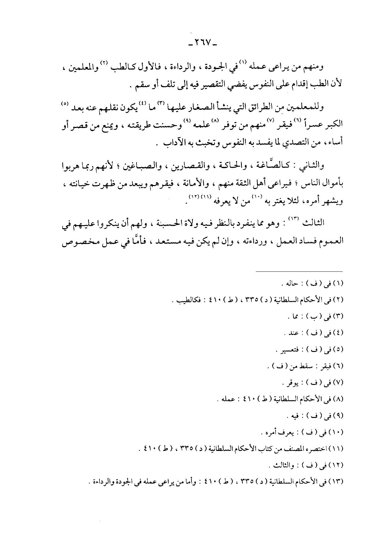 ومنهم من يراعى عمله في الجودة، والرداءة، فالأول كالطب والمعلمين، لأن الطب إقدام على النفوس يفضي التقصير فيه إلى تلف أو سقم.
