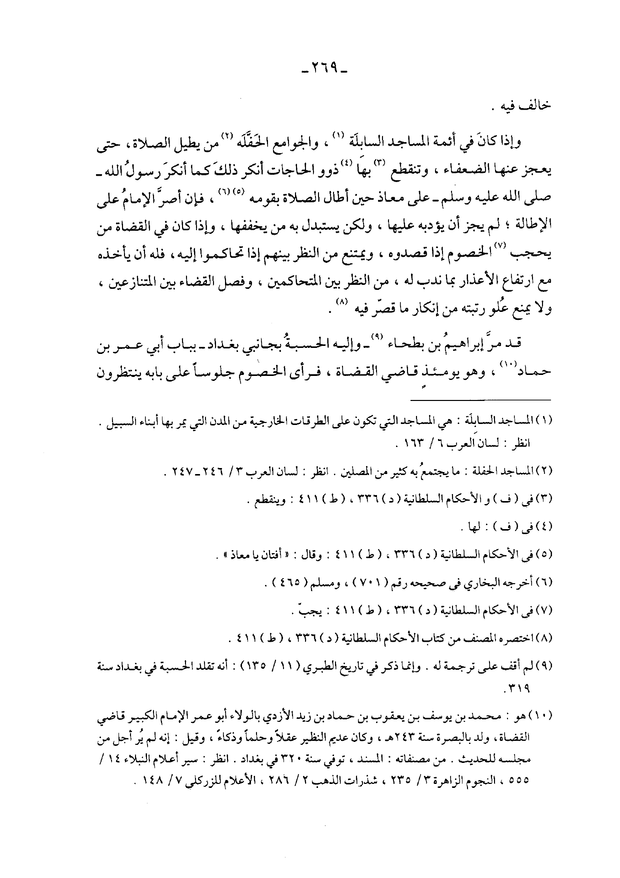 وإذا كان في أئمة المساجد السابلة، والجوامع الحفله من يطيل الصلاة، حتى يعجز عنها الضعفاء، وتنقطع بها ذوو الحاجات أنكر ذلك كما أنكر رسول الله – صلى الله عليه وسلم – على معاذ حين أطال الصلاة بقومه، فإن أصر الإمام على الإطالة؛ لم يجز أن يؤدبه عليها، ولكن يستبدل به من يخففها، وإذا كان في القضاة من يحجب الخصوم إذا قصدوه، ويمتنع من النظر بينهم إذا تحاكموا إليه، فله أن يأخذه مع ارتفاع الأعذار بما ندب له، من النظر بين المتحاكمين، وفصل القضاء بين المتنازعين، ولا يمنع علو رتبته من إنكار ما قصر فيه.