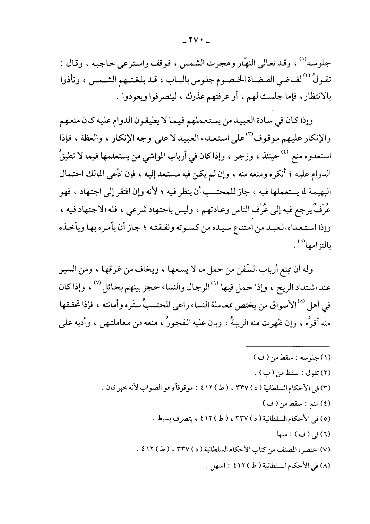وإذا كان في سادة العبيد من يستعملهم فيما لا يطيقون الدوام عليه كان منعهم والإنكار عليهم موقوف على استعداء العبيد لا على وجه الإنكار، والعظة، فإذا استعدوه منع حينئذ، وزجر، وإذا كان في أرباب المواشي من يستعملها فيما لا تطيق الدوام عليه؛ أنكره ومنعه منه، جاز للمحتسب أن ينظر فيه؛ لأنه وإن افتقر إلى اجتهاد، فهو عرف يرجع فيه إلى عرف الناس وعادتهم، وليس باجتهاد شرعي، فله الاجتهاد فيه، وإذا استعداه العبد من امتناع سيده من كسوته ونفقته؛ جاز أن يأمره بها ويأخذه بالتزامها.