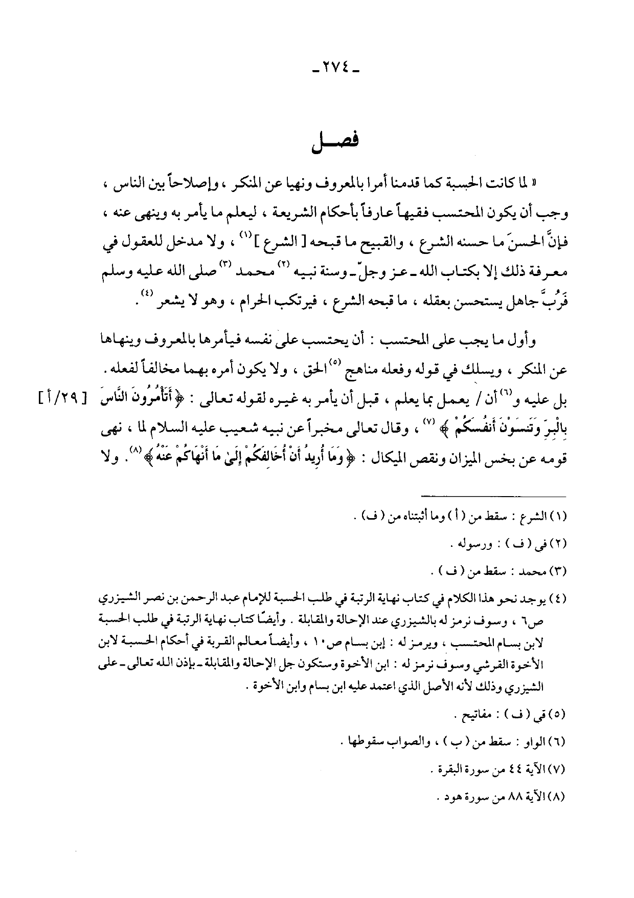 وأول ما يجب على المحتسب: أن يحتسب على نفسه فيأمرها بالمعروف وينهاها عن المنكر، ويسلك في قوله وفعله مناهج الحق، ولا يكون أمره بهما مخالفاً لفعله. بل عليه وأن / يعمل بما يعلم، قبل أن يأمر به غيره لقوله تعالى: {أتأمرون الناس بالبر وتنسون أنفسكم}، وقال تعالى مخبراً عن نبيه شعيب عليه السلام لما، نهى قومه عن بخس الميزان ونقص الميكال: {وما أريد أن أخالفكم إلى ما أنهاكم عنه}. ولا
