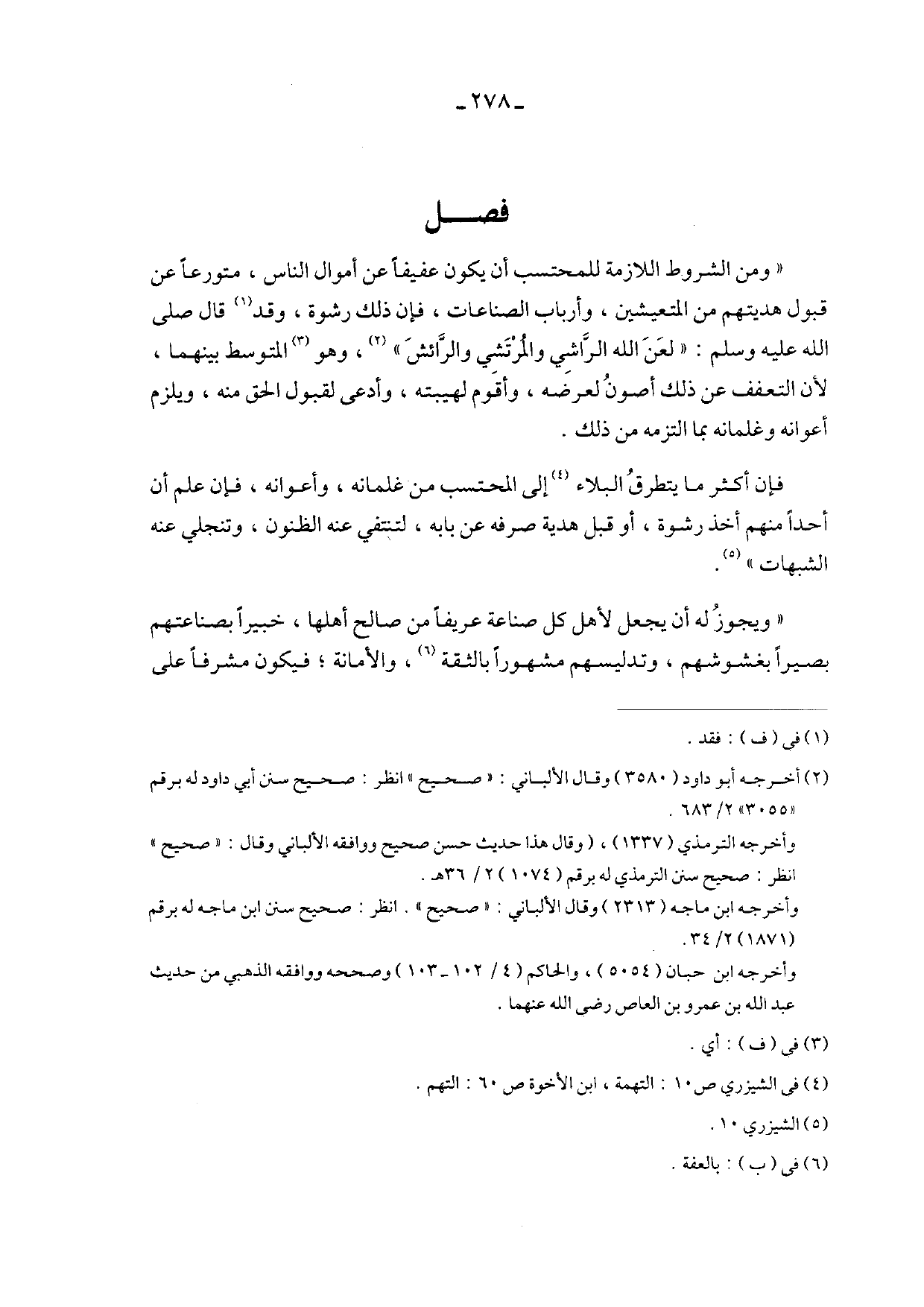 "ومن الشروط اللازمة للمحتسب أن يكون عفيفاً عن أموال الناس، متورعاً عن قبول هديتهم من المتعيشين، وأرباب الصناعات، فإن ذلك رشوة، وقد قال صلى الله عليه وسلم: "لعن الله الراشي والمرتشي والرائش"، وهو المتوسط بينهما، لأن التعفف عن ذلك أصون لعرضه، وأقوم لهيبته، وأدعى لقبول الحق منه، ويلزم أعوانه وغلمانه بما التزمه من ذلك.