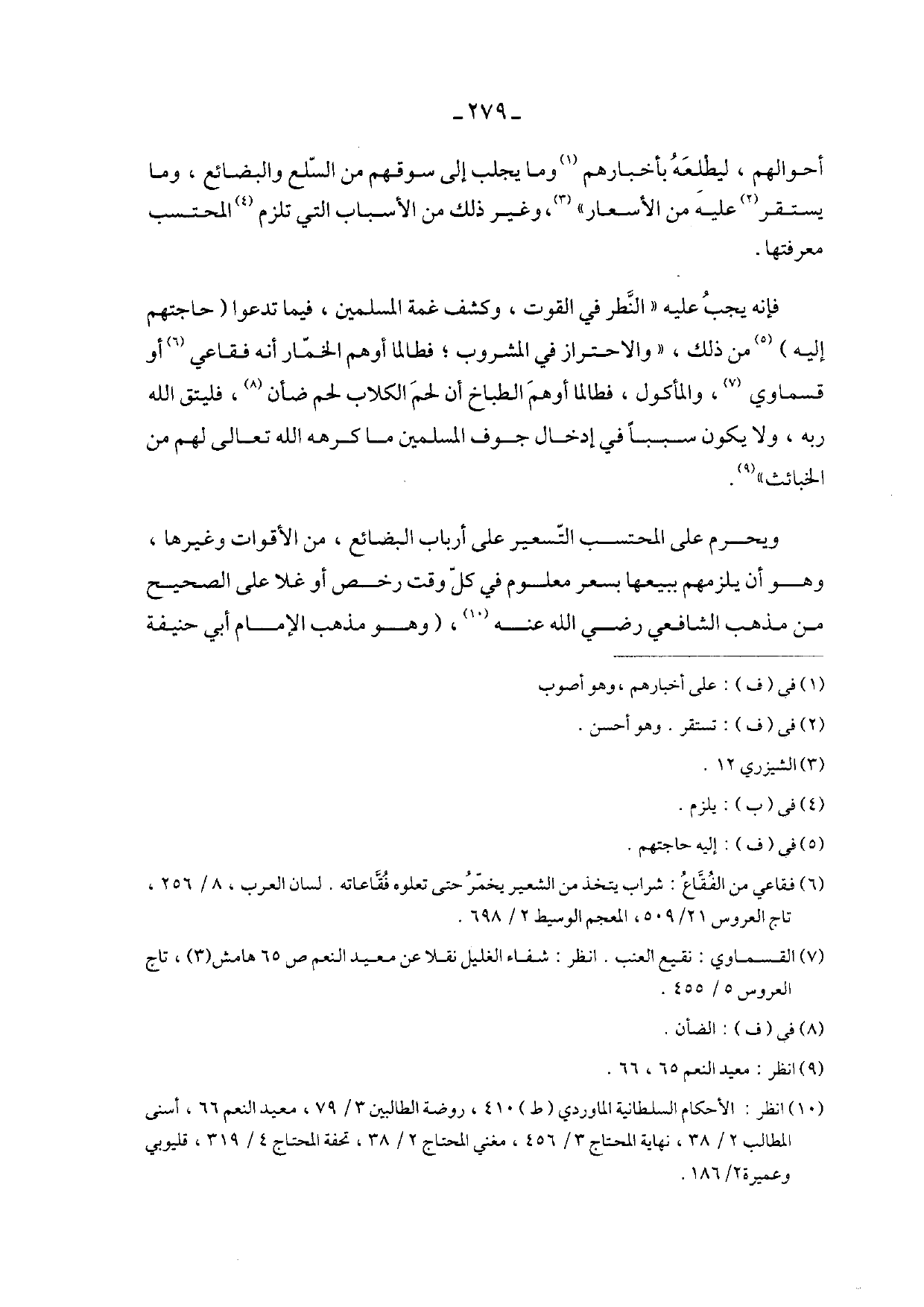 فإنه يجب عليه "النظر في القوت، وكشف غمة المسلمين، فيما تدعوا (حاجتهم إليه) من ذلك، "والاحتراز في المشروب؛ فطالما أوهم الخمار أنه فقاعي أو قسماوي، والمأكول، فطالما أوهم الطباخ أن لحم الكلاب لحم ضأن، فليتق الله ربه، ولا يكون سبباً في إدخال جوف المسلمين ما كرهه الله تعالى لهم من الخبائث".