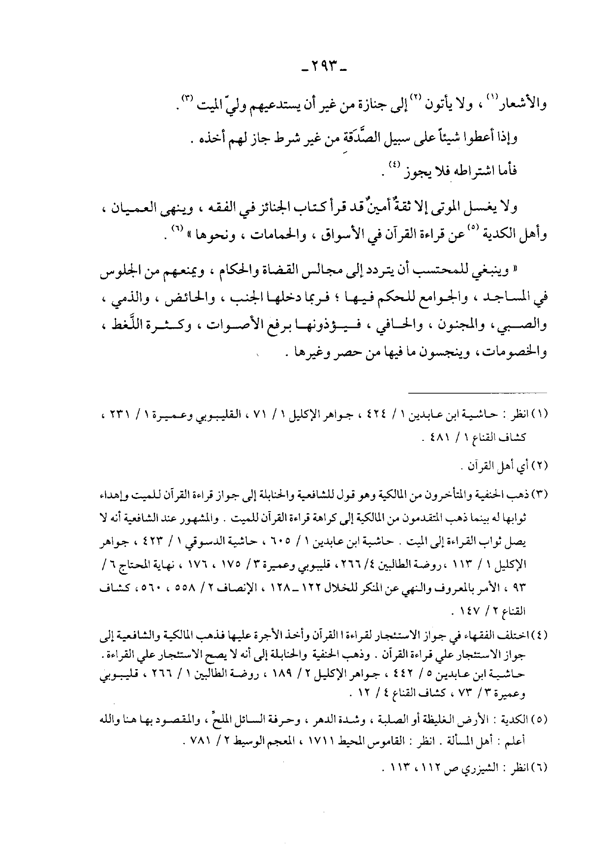 ولا يغسل الموتى إلا ثقة أمين قد قرأ كتاب الجنائز في الفقه، وينهى العميان، وأهل الكدية عن قراءة القرآن في الأسواق، والحمامات، ونحوها".