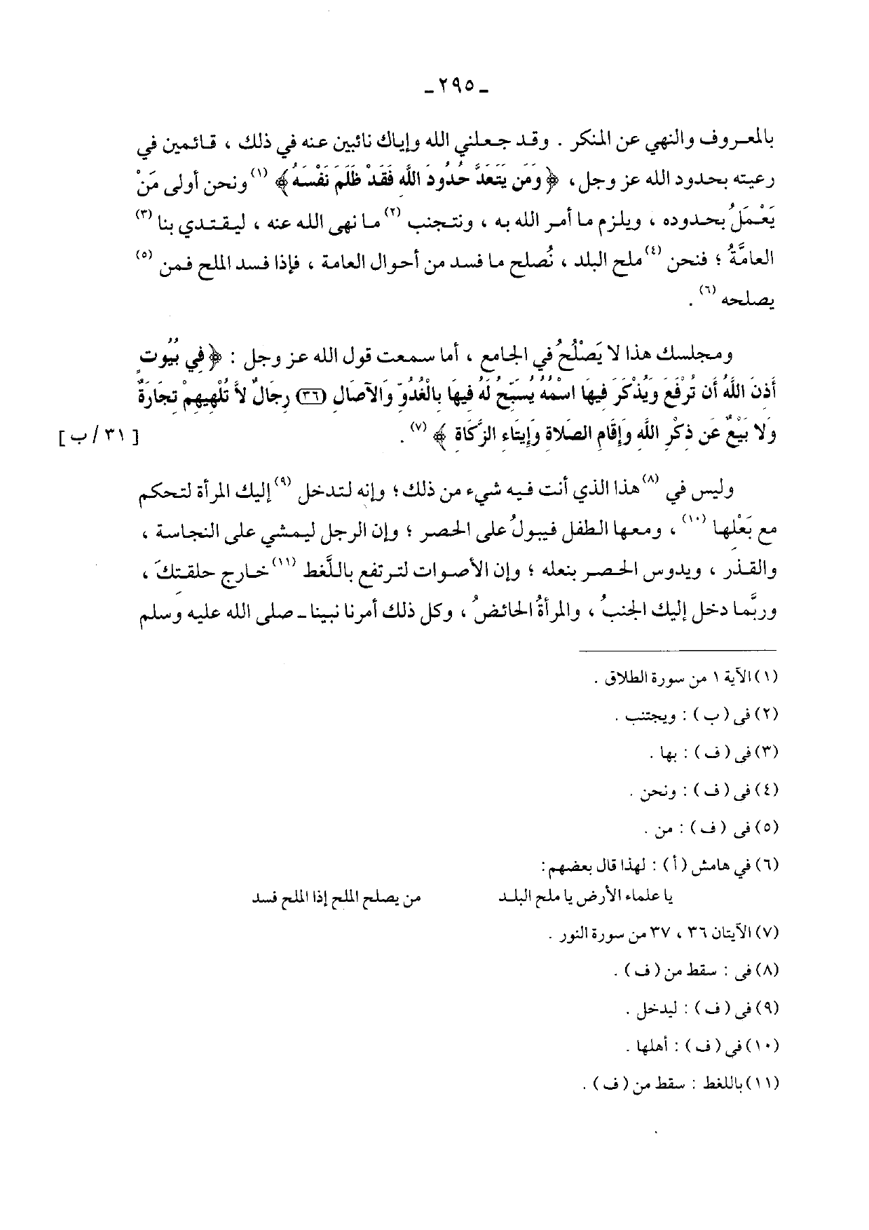 بالمعروف والنهي عن المنكر. وقد جعلني الله وإياك نابين عنه في ذلك، قائمين في رعيته بحدود الله عز وجل، {ومن يتعد حدود الله فقد ظلم نفسه} ونحن أولى من يعمل بحدوده، ويلزم ما أمر الله به، ونتجنب ما نهى الله عنه، ليقتدي بنا العامة؛ فنحن ملح البلد، نصلح ما فسد من أحوال العامة، فإذا فسد الملح فمن يصلحه.