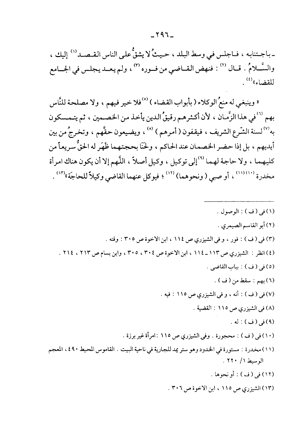 "وينبغي له منه الوكلاء (بأبواب القضاء) فلا خير فيهم، ولا مصلحة للناس بهم في هذا الزمان، لأن أكثرهم رقيق الدين يأخذ من الخصمين، ثم يتمسكون به لسنة الشرع الشريف، فيقفون (أمرهم)، ويضيعون حقهم، وتخرج من بين أيديهم، بل إذا حضر الخصمان عند الحاكم، ولحناً بحجتهما ظهر له الحق سريعاً من كليهما، ولا حاجة لهما إلى توكيل، وكيل أصلاً، اللهم إلا أن يكون هناك امرأة مخدرة، أو صبي (ونحوهما)؛ فيوكل عنهما القاضي وكيلاً للحاجة".