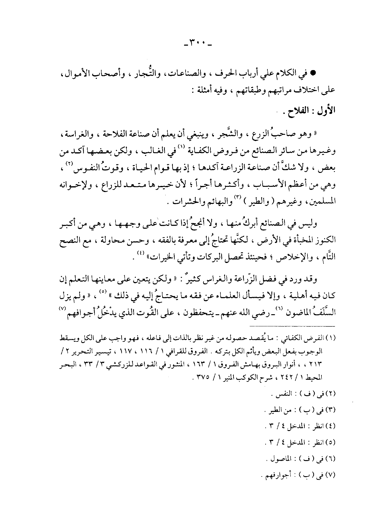"وهو صاحب الزرع، والشجر، وينبغي أن يعلم أن صناعة الفلاحة، والغراسة، وغيرها من سائر الصنائع من فروض الكفاية في الغالب، ولكن بعضها أكد من بعض، ولا شك أن صناعة الزراعة أكدها؛ إذ بها قوام الحياة، وقوت النفوس، وهي من أعظم الأسباب، وأكثرها أجرًا؛ لأن خيرها متعد للزراع، ولإخوانه المسلمين، وغيرهم (والطير) والبهائم والحشرات.