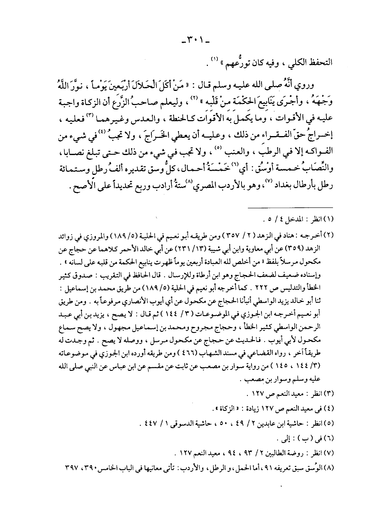 وروي أنه صلى الله عليه وسلم قال: "من أكل الحلال أربعين يومًا، نور الله وجهه، وأجرى ينابيع الحكمة من قلبه"، وليعلم صاحب الزرع أن الزكاة واجبة عليه في الأقوات، وما يكمل به الأقوات كالحنطة، والعدس وغيرهما فعليه، إخراج حق الفقراء من ذلك، وعليه أن يعطي الخراج، ولا تجب في شيء من الفواكه إلا في الرطب، والعنب، ولا تجب في شيء من ذلك حتى تبلغ نصابا، والنصاب خمسة أوسق: أي خمسة أحمال، كل وسق تقديره ألف رطل وستمائة رطل بأرطال بغداد، وهو بالأردب المصري ستة أرادب وربع تحديدًا على الأصح.