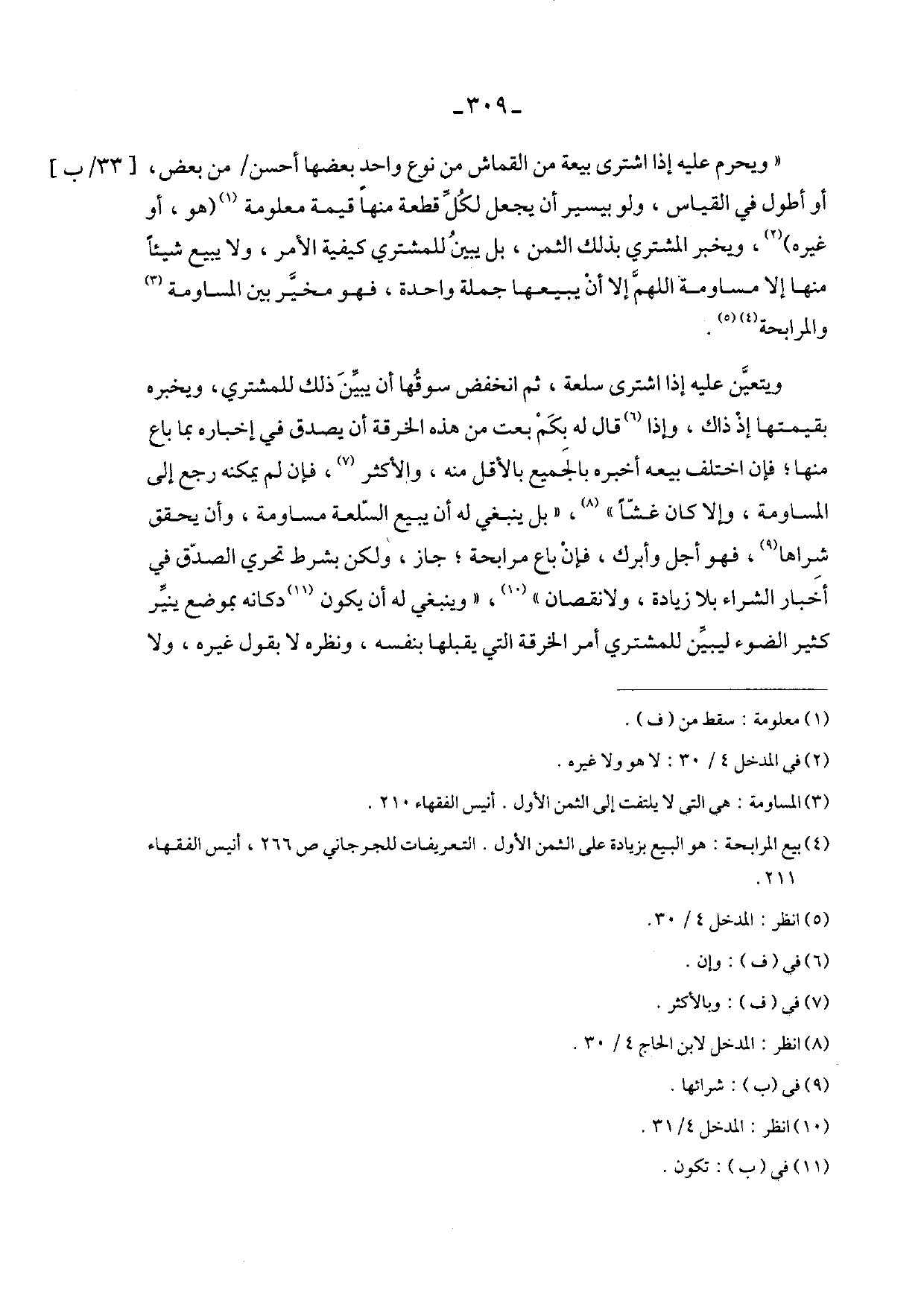 "ويحرم عليه إذا اشترى بيعة من القماش من نوع واحدٍ بعضها أحسن / من بعض، أو أطول في القياس، ولو بيسير أن يجعل لكل قطعة منها قيمة معلومة (هو، أو غيره)، ويخبر المشتري بذلك الثمن، بل يبين للمشتري كيفية الأمر، ولا يبيع شيئًا منها إلا مساومة اللهم إلا أن يبيعها جملة واحدة، فهو مخير بين المساومة والمرابحة.