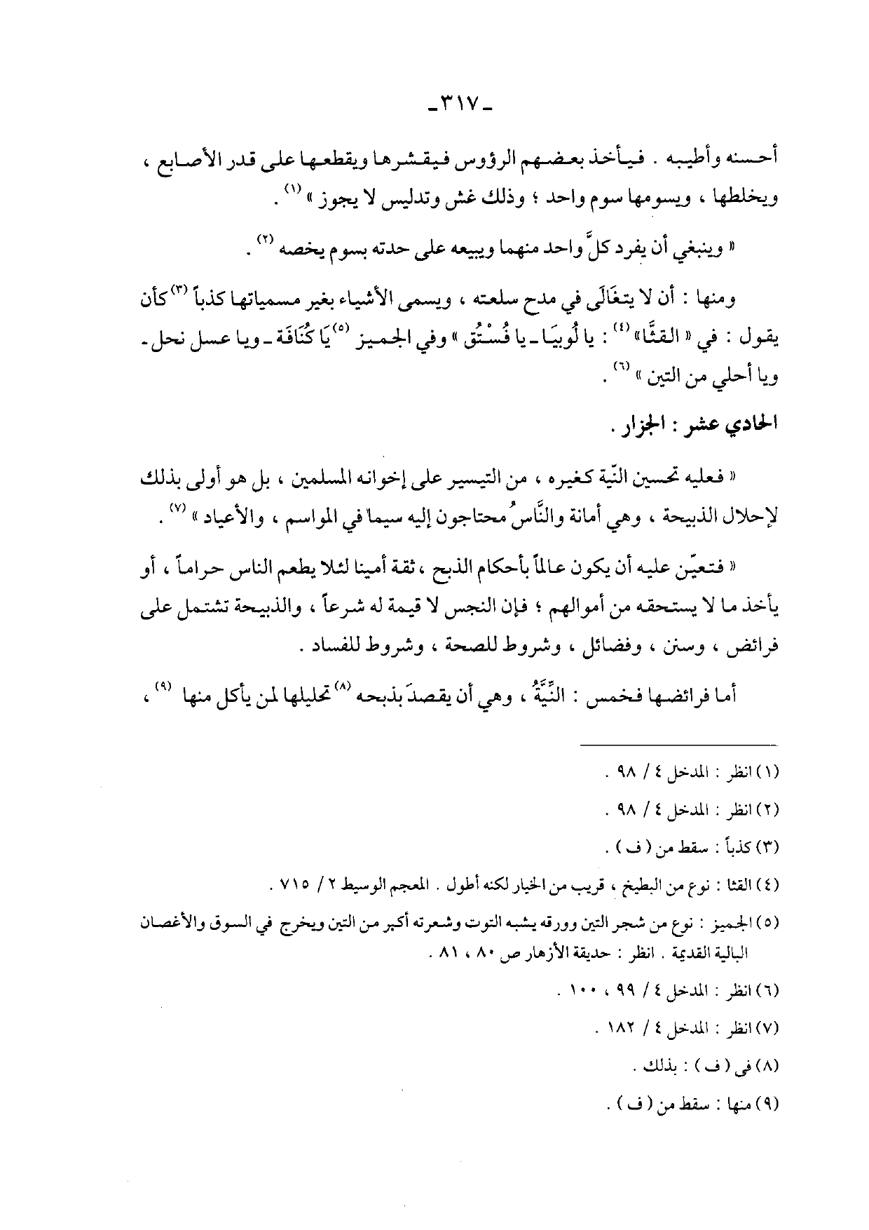 ومنها: أن لا يتغالى في مدح سلعته، ويسمى الأشياء بغير مسمياتها كذبًا كأن يقول: في"القثا": يا لوبيا - يا فستق" وفي الجميز يا كنافة - ويا عسل نحل- ويا أحلى من التين".
