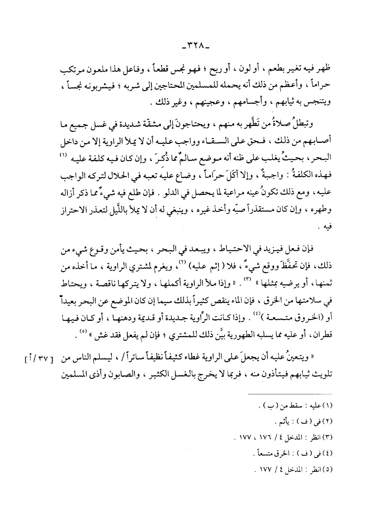 "ويتعين عليه أن يجعل على الرواية غطاء كثيفًا نظيفًا ساترًا /، ليسلم الناس من تلويث ثيابهم فيتأذون منه، فربما لا يخرج بالغسل الكثير، والصابون وأذى المسلمين [37/أ]