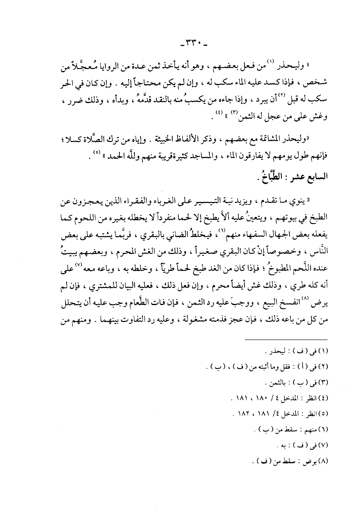 "وليحذر من فعل بعضهم، وهو أنه يأخذ ثمن عدة من الروايا معجلاً من شخص، فإذا كسد عليه الماء سكب له، وإن لم يكن محتاجًا إليه. وإن كان في الحر سكب له قبل أن يبرد، وإذا جاءه من يكسب منه بالنقد قدمه، وبدأه، وذلك ضرر وغش على من عجل له الثمن".