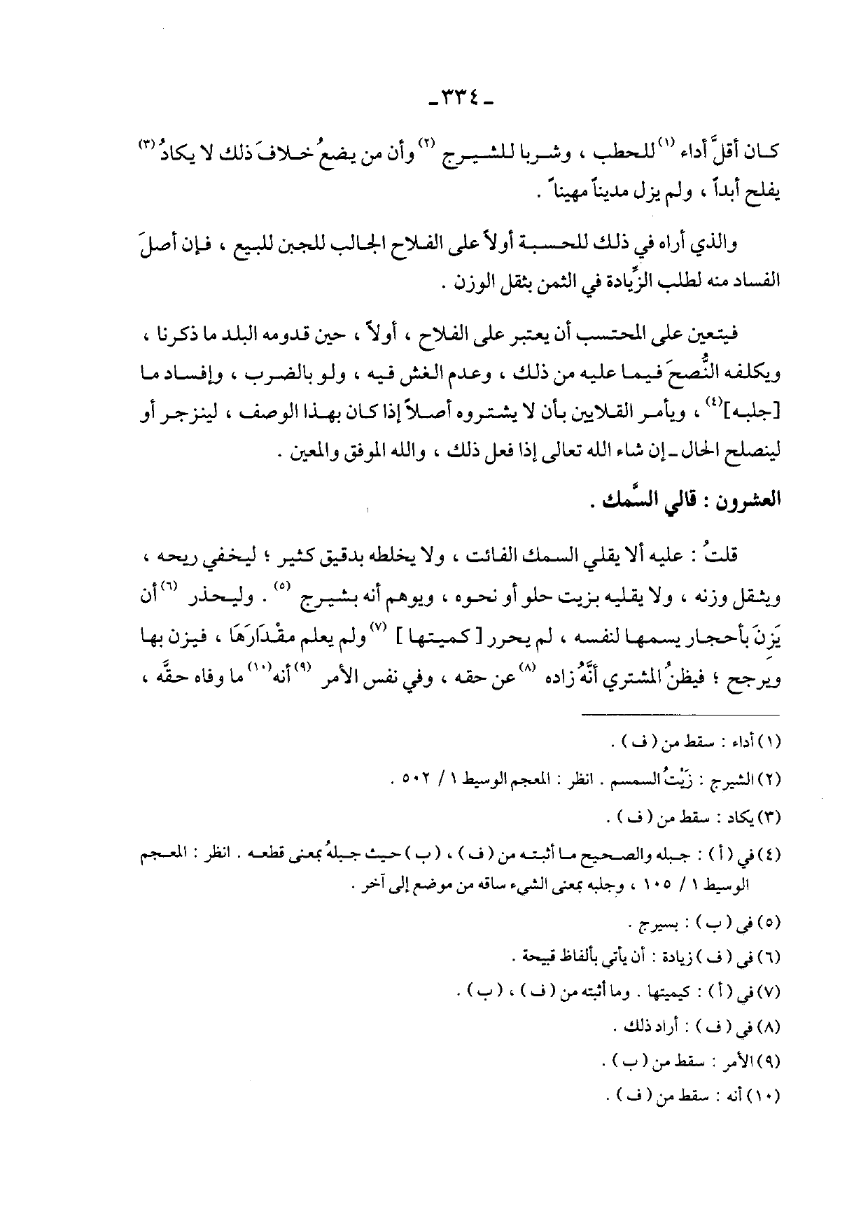قلت: عليه ألا يقلي السمك الفائت، ولا يخلطه بدقيق كثير؛ ليخفي ريحه، ويثقل وزنه، ولا يقليه بزيت حلو أو نحوه، ويوهم أنه بشيرج. وليحذر أن يزن بأحجار يسمها لنفسه، لم يحرر [كميتها] ولم يعلم مقدارها، فيزن بها ويرجح؛ فيظن المشتري أنه زاده عن حقه، وفي نفس الأمر أنه ما وفاه حقه،