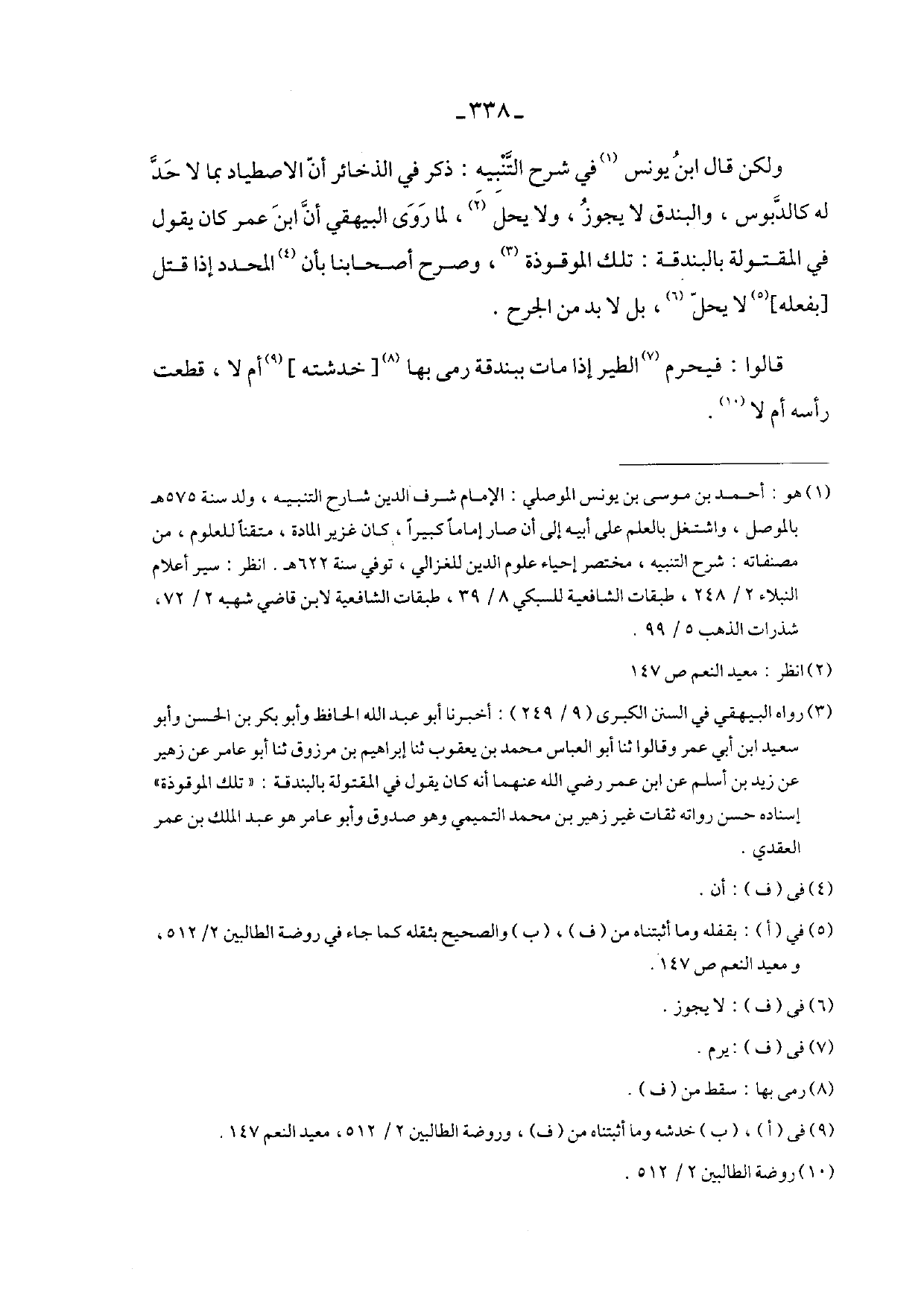 ولكن قال ابن يونس في شرح التنبيه: ذكر في الذخائر أن الاصطياد بما لا حد له كالدبوس، والبندق لا يجوز، ولا يحل، لما روى البيهقي أن ابن عمر كان يقول في المقتولة بالبندقية: تلك الموقوذة، وصرح أصحابنا بان المحدد إذا قتل [بفعله] لا يحل، بل لابد من الجرح.