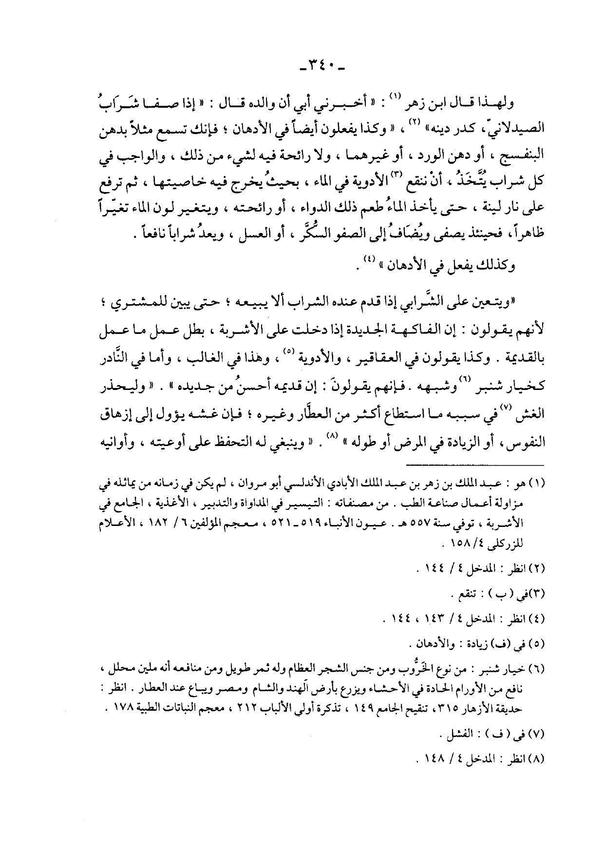 ولهذا قال ابن زهر: "أخبرني أبي أن والده قال: "إذا صفا شراب الصيدلاني، كدر دينه"، "وكذا يفعلون أيضًا في الأدهان؛ فإنك تسمه مثلاً بدهن البنفسج، أو دهن الورد، أو غيرهما، ولا رائحة فيه لشيء من ذلك، والواجب في كل شراب يتخذ، أن ننقع الأدوية في الماء، بحيث يخرج فيه خاصيتها، ثم ترفع على نار لينة، حتى يأخذ الماء طعم ذلك الدواء، أو رائحته، ويتغير لون الماء تغيرًا ظاهرًا، فحينئذ يصفي ويضاف إلى الصفو السكر، أو العسل، ويعد شرابًا نافعًا.