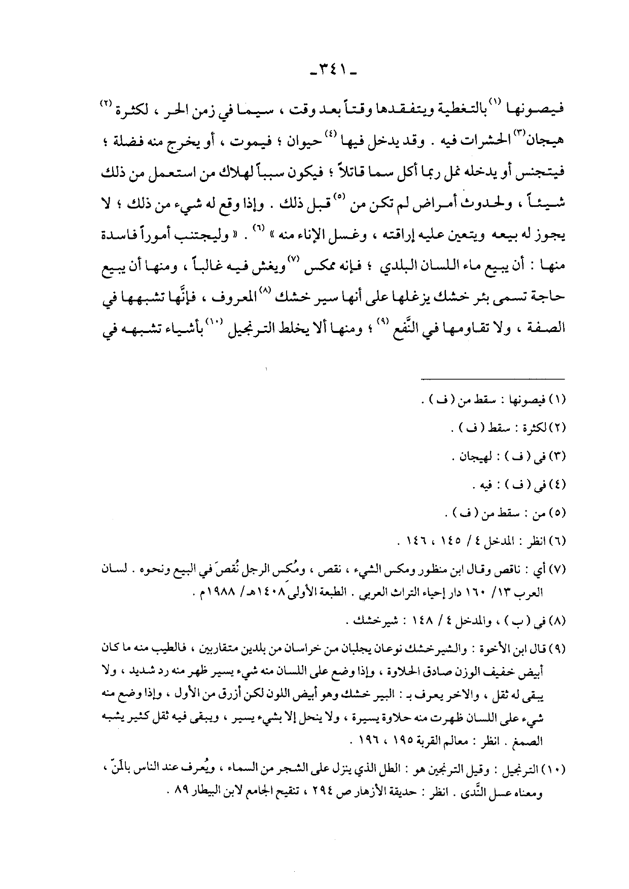 فيصونها بالتغطية ويتفقدها وقتًا بعد وقت، سيما في زمن الحر، لكثرة هيجان الحشرات فيه. وقد يدخل فيها حيوان؛ فيموت، أو يخرج منه فضلة؛ فيتجنس أو يدخله نمل ربما أكل سمًا قاتلاً؛ فيكون سببًا لهلاك من استعمل من ذلك شيئًا، ولحدوث أمراض لم تكن من قبل ذلك. وإذا وقع له شيء من ذلك؛ لا يجوز له بيعه ويتعين عليه إراقته، وغسل الإناء منه". "وليجتنب أمورًا فاسدة منها: أن يبيع ماء اللسان البلدي؛ فإنه ممكس ويغش فيه غالبًا، ومنها أن يبيع حاجة تسمى بئر خشك يزغلها على أنها سير خشك المعروف، فإنها تشبهها في الصفة، ولا تقاومها في النفع؛ ومنها ألا يخلط الترنجيل بأشياء تشبهه في