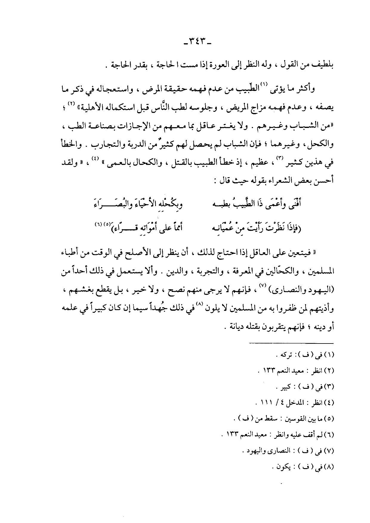 "فيتعين على العاقل إذا احتاج لذلك، أن ينظر إلى الأصلح في الوقت من أطباء المسلمين، والكحالين في المعرفة، والتجربة، والدين. وألا يستعمل في ذلك أحدًا من (اليهود والنصارى)، فإنهم لا يرجى منهم نصح، ولا خير، بل يقطع بغشهم، وأذيتهم لمن ظفروا به من المسلمين لا يلون في ذلك جهدًا سيما إن كان كبيرًا في علمه أو دينه؛ فإنهم يتقربون بقتله ديانة.
