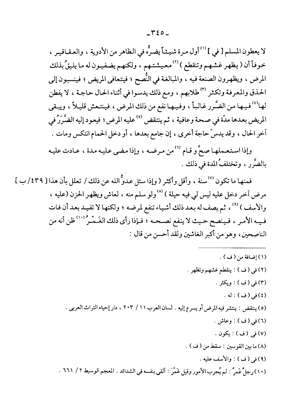 فمنها ما تكون سنة، وأقل وأكثر (وإذا سئل عدو الله عن ذلك / تعلل بأن هذا مرض آخر دخل عليه ليس فيه حيلة) ولو سلم منه، لعاش ويظهر الحزن (عليه، والأسف)، ثم يصف له بعد ذلك أشياء تنفع لمرضه؛ ولكنها لا تفيد بعد أن فات فيه الأمر، فينصح حيث لا ينفع نصحه؛ فإذا رأى ذلك الغمر ظن أنه من الناصحين، وهو من أكبر الغاشين ولقد أحسن من قال: [439/ب]