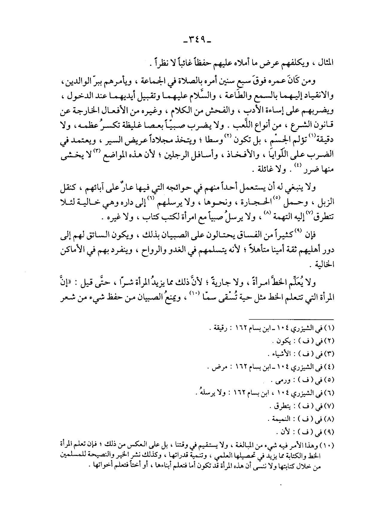 ومن كان عمره فوص سبع سنين أمره بالصلاة في الجماعة، ويأمرهم ببر الوالدين، والانقياد إليهما بالسمع والطاعة، والسلام عليهما وتقبيل أديهما عند الدخول، ويضربهم على إساءة الأدب، والفحش من الكلام، وغيره من الأفعال الخارجة عن قانون الشرع، من أنواع اللعب، ولا يضرب صبياً بعصاً غليظة تكسر عظمه، ولا دقيقة تؤلم الجسم، بل تكون وسطاً؛ ويتخذ مجلاداً عريض السير، ويعتمد في الضرب على اللوايا، والأفخاذ، وأسافل الرجلين؛ لأن هذه المواضع لا يخشى منها ضرر. ولا غائلة.