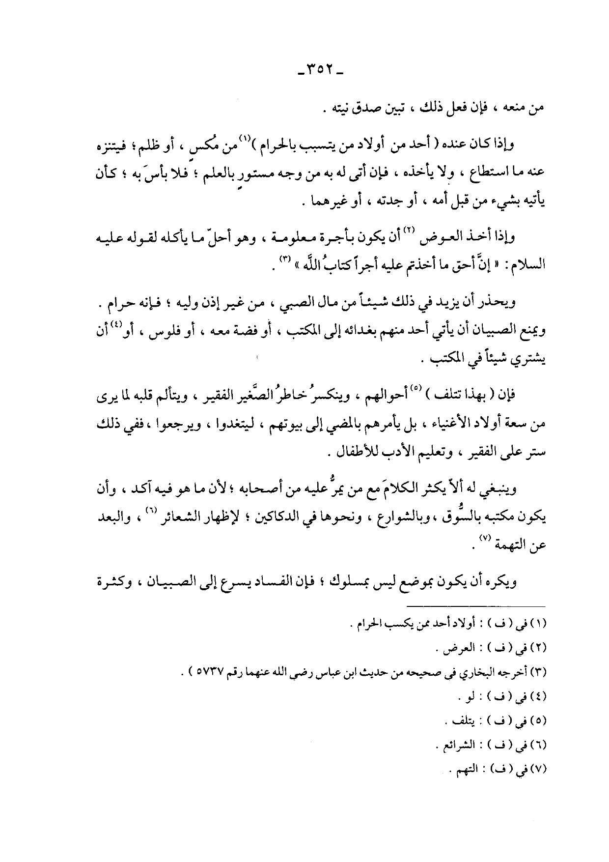 فإن (بهذا تتلف) أحوالهم، وينكسر خاطر الصغير الفقير، ويتألم قلبه لما يرى من سعة أولاد الأغنياء، بل يأمرهم بالمضي إلى بيوتهم، ليتغدوا، ويرجعوا، ففي ذلك ستر على الفقير، وتعليم الأدب للأطفال.