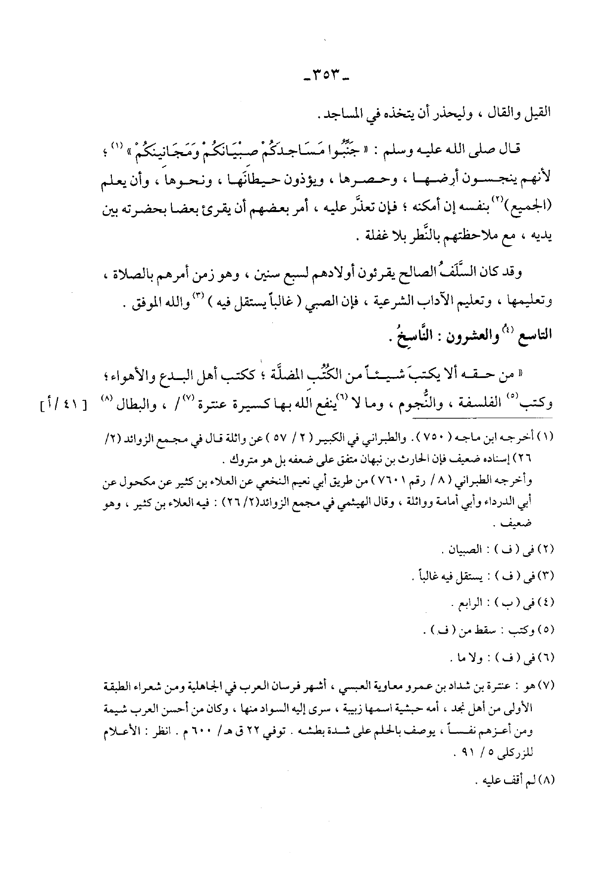 "من حقه ألا يكتب شيئًا من الكتب المضلة، ككتب أهل البدع والأهواء؛ وكتب الفلسفة، والنجوم، وما لا ينفع الله بها كسيرة، عنترة /، والبطال [41/أ]