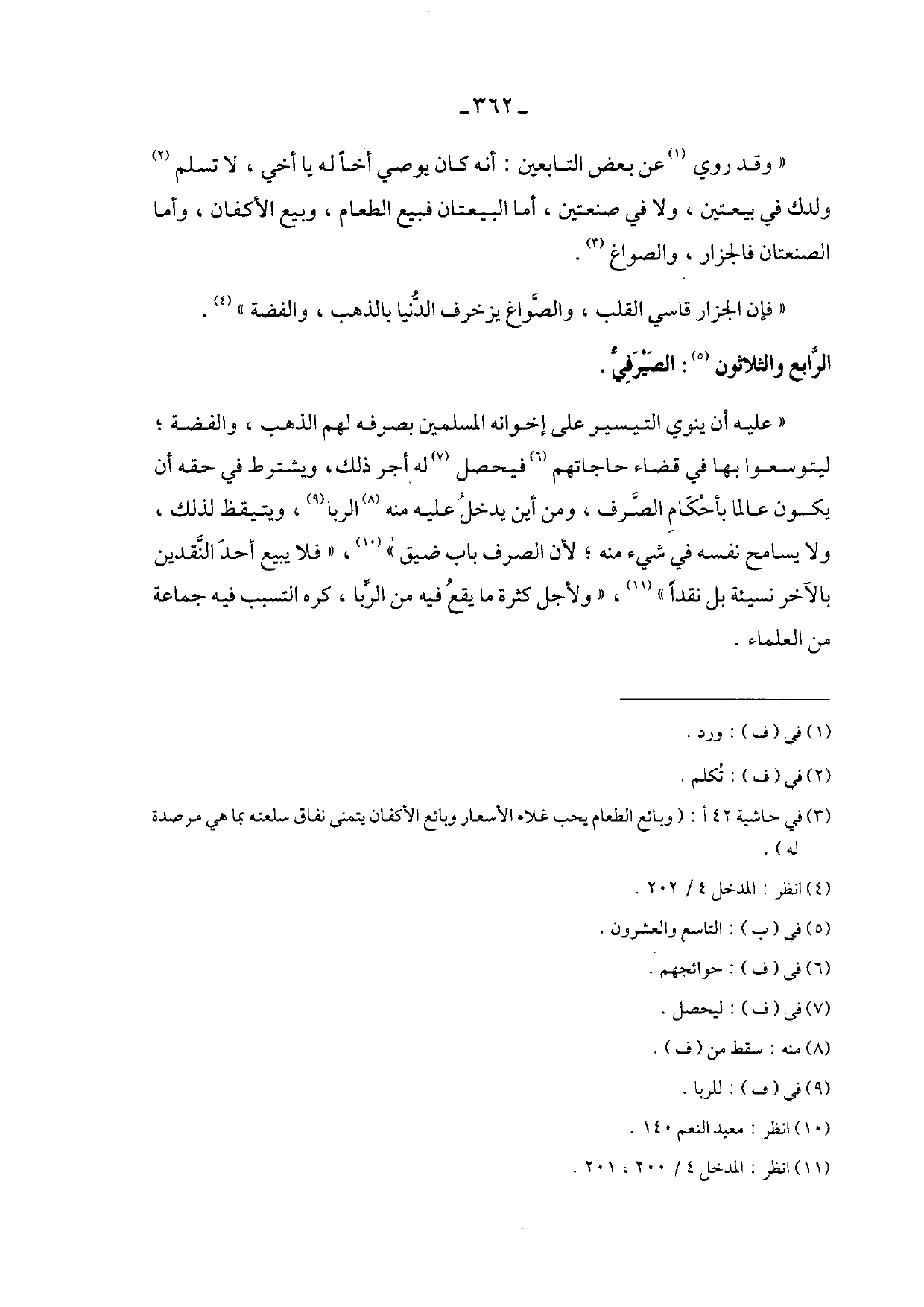 "عليه أن ينوي التيسير على إخوانه المسلمين بصرفه لهم الذهب، والفضة؛ ليتوسعوا بها في قضاء حاجاتهم فيحصل له أجر ذلك، ويتيقظ لذلك، ولا يسامح نفسه في شيء منه؛ لان الصرف باب ضيق"، " فلا يبيع أحد النقدين بالآخر نسيئة بل نقدًا"، "ولأجل كثرة ما يقعُ من الربا، كره التسبيب فيه جماعة من العلماء.