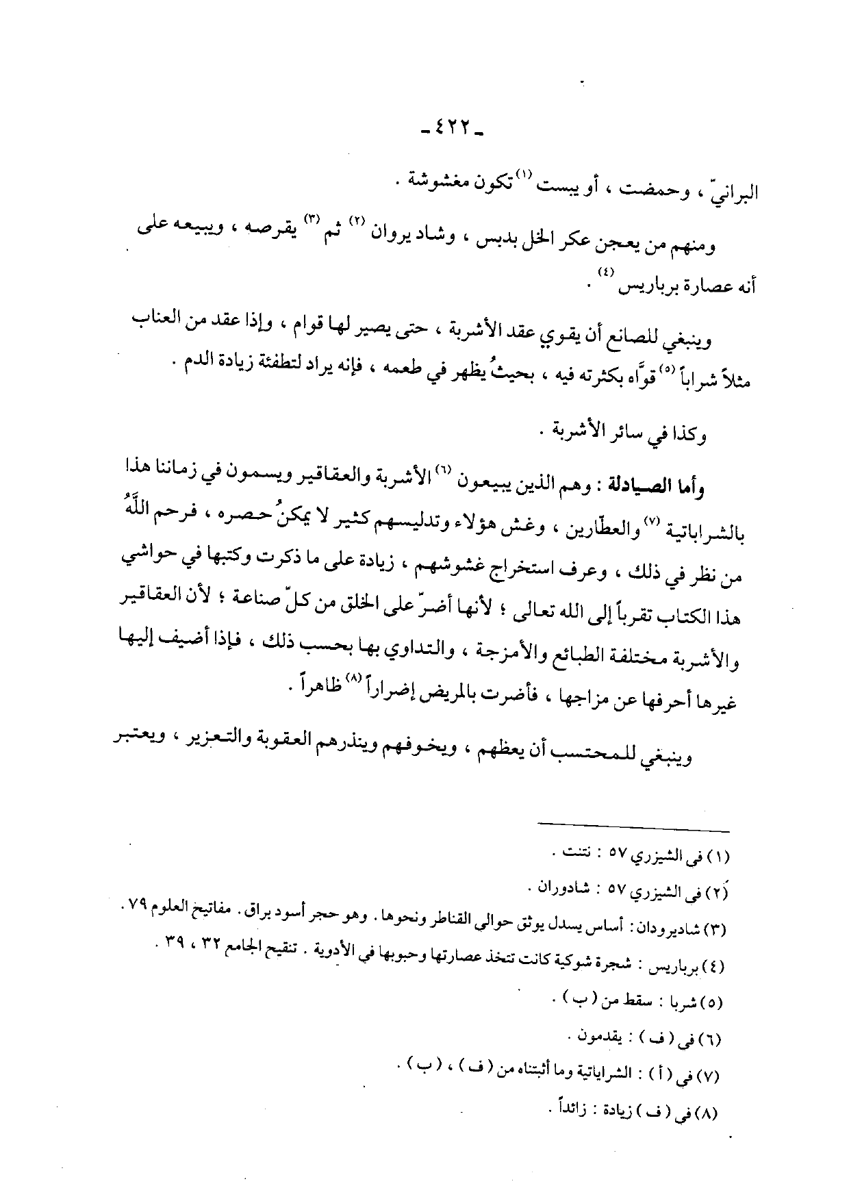 وأما الصيادلة: وهم الذين يبيعون الأشربة والعقاقير ويسمون في زماننا هذا بالشراباتية والعطارين، وغش هؤلاء وتدليسهم كثير لا يمن حصره، فرحم الله من نظر في ذلك، وعرف استخراج غشوشهم، زيادة على ما ذكرت وكتبها في حواشي هذا الكتاب تقرباً إلى الله تعالى، لأنها أصر على الخلق من كل صناعة؛ لأن العقاقير والأشربة مختلفة الطبائع والمزحة، والتداوي بها بحسب ذلك، فإذا أضيف إليها غيرها أحرفها عن مزاجها، فأضربت بالمريض إضراراً ظاهراً.