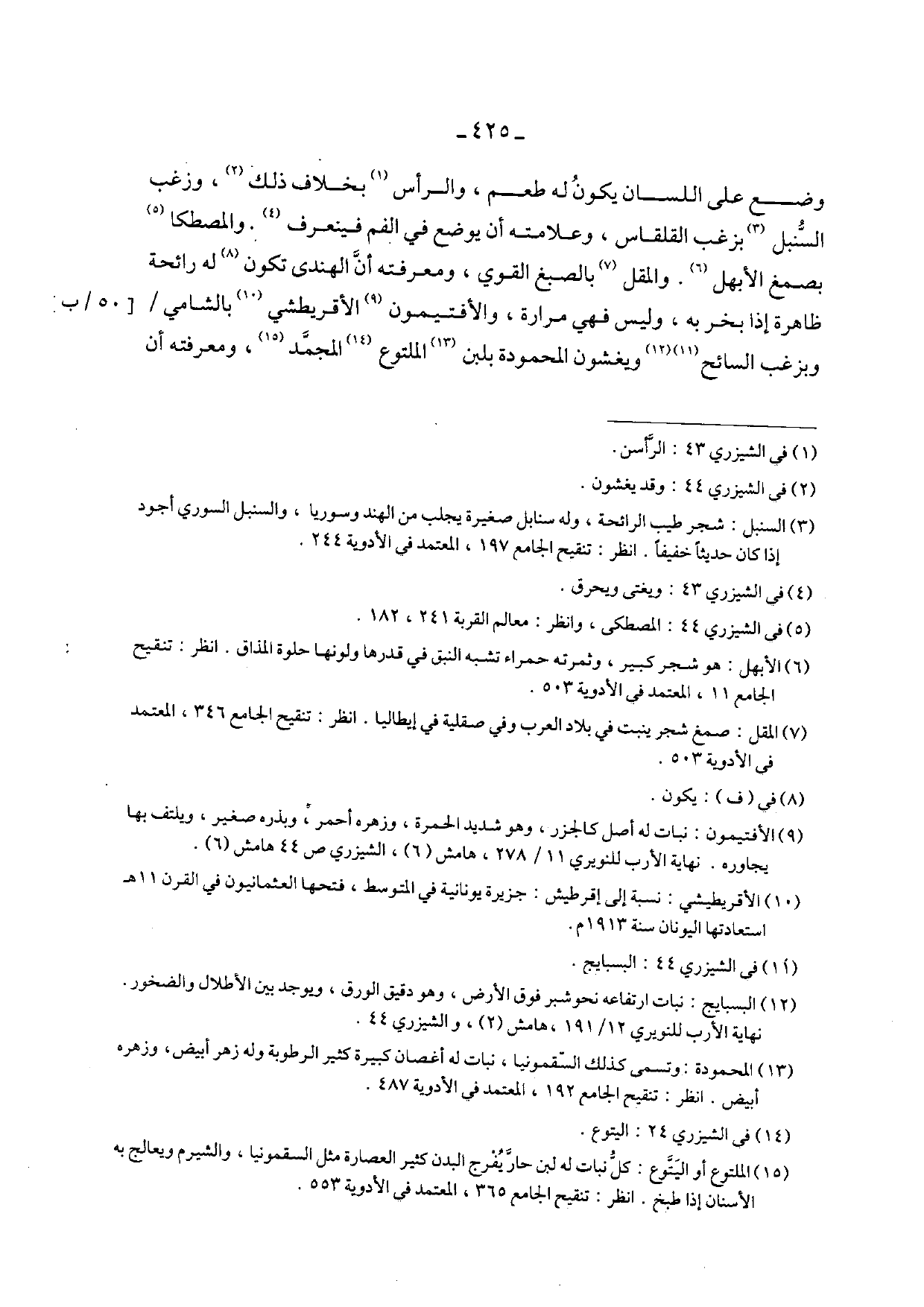 وضع على اللسان يكون له طعم، والرأس بخلاف ذلك، وزغب السنبل بزغب القلقاس، وعلامته أن يوضع في الفم فينعرف. والمصطكا بصمغ الأبهل. والمقل بالصبغ القوي، ومعرفته أن الهندى تكون له رائحة ظاهرة إذا بخر به، وليس فهي مرارة، والأفتيمون الأقريطشي، بالشامي / وبزغب السائح ويغشون المحمودة بلبن الملتوع المجمد، ومعرفته أن