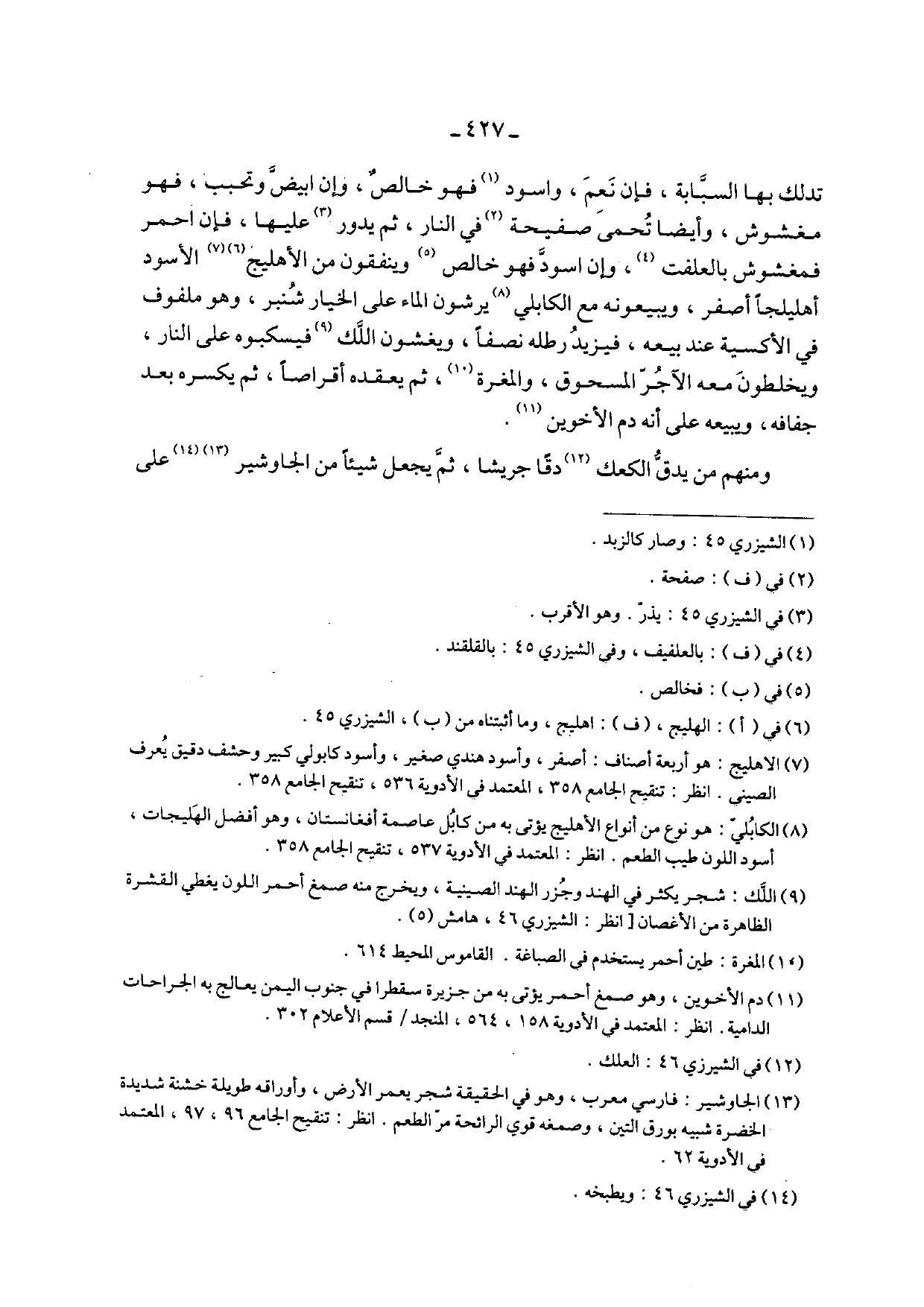 تدلك بها السبابة، فغن نعم، واسود فهو خالصٌ، وإن ابيض وتحبب، فهو مغشوش، وأيضاً تحمى صفيحة في النار، ثم يدور عليها، فإن أحمر فمغشوش بالعلفت، وإن أسود فهو خالص وينفقون من الأهليج الأسود أهليجاً أصفر، ويبيعونه مع الكابلي يرشون الماء على الخيار شنبر، وهو ملفوف في الأكسية عند بيعه، فيزيد رطله نصفاً، ويغشون اللك فيسكبوه على النار، ويخلطون معه الآجر المسحوق، والغرة، ثم يعقده أقراصاً، ثم يكسره بعد جفافه، ويبيعه على أنه دم الأخوين.