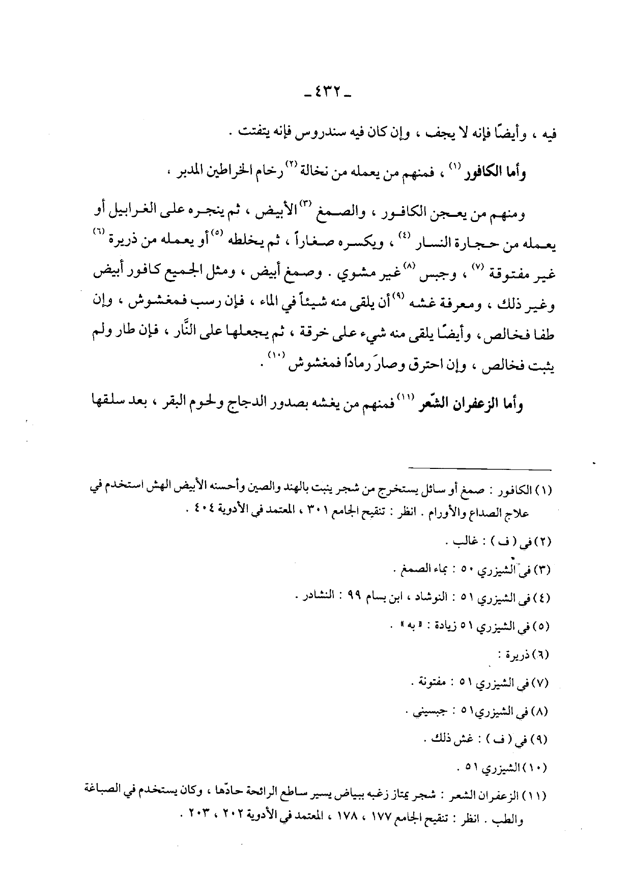 ومنهم من بعجن الكافور، والصمغ الأبيض، ثم ينجره على الغرابيل أو يعمله من حجارة النسار، ويكسره صغاراً، ثم يخلطه أو يعمله من ذريرة غير مفتوقة، وجبس غير مشوي. وصمغ أبيض، ومثل الجميع كافور أبيض وغير ذلك، ومعرفة غشه أن يلقى منه شيئاً في الماء، فإن رسب فمغشوش، وإن طفا فخالص، وأيضًا يلقى منه شيء على خرقة، ثم يجعلها على النار، فإن طار ولم يثبت فخالص، وإن احترق وصار رمادًا فمغشوش.