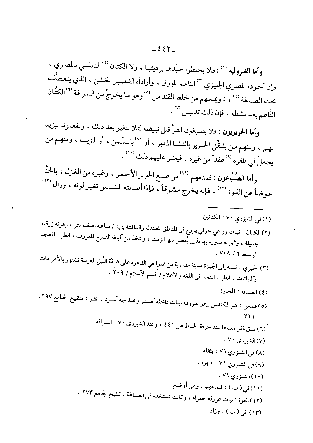 وأما الغزولية: فلا يخلطوا جيدها برديئها، ولا الكتان النابلسي بالمصري، فإن أجوده المصري الجيزي الناعم المورق، وأرادأه القصير الخشن، الذي يتعصف تحت الصدفة، : ويمنعهم من خلط القنداس وهو ما يخرج من السرافة الكتان الناعم بعد مشطه، فإن ذلك تدليس.