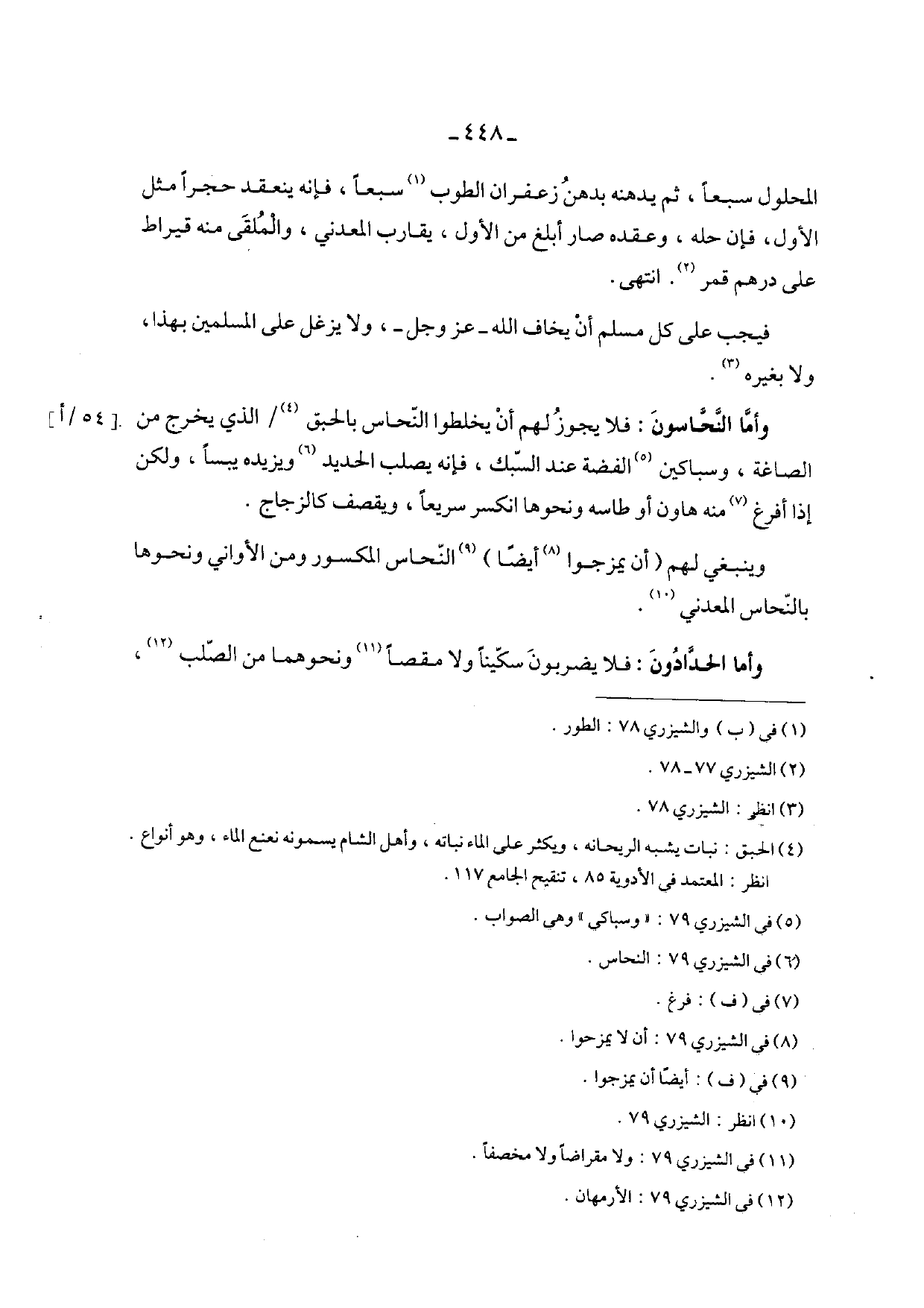 وأما النحاسون: فلا يجوز لهم أن يخلطوا النحاس بالحبق / الذي يخرج من الصاغة، وسباكين الفضة عند السبك، فإنه يصلب الحديد ويزده يبساً، ولكن إذا أفرغ منه هاون أو طائه ونحوها انكسر سريعاً، ويقصف كالزجاج.