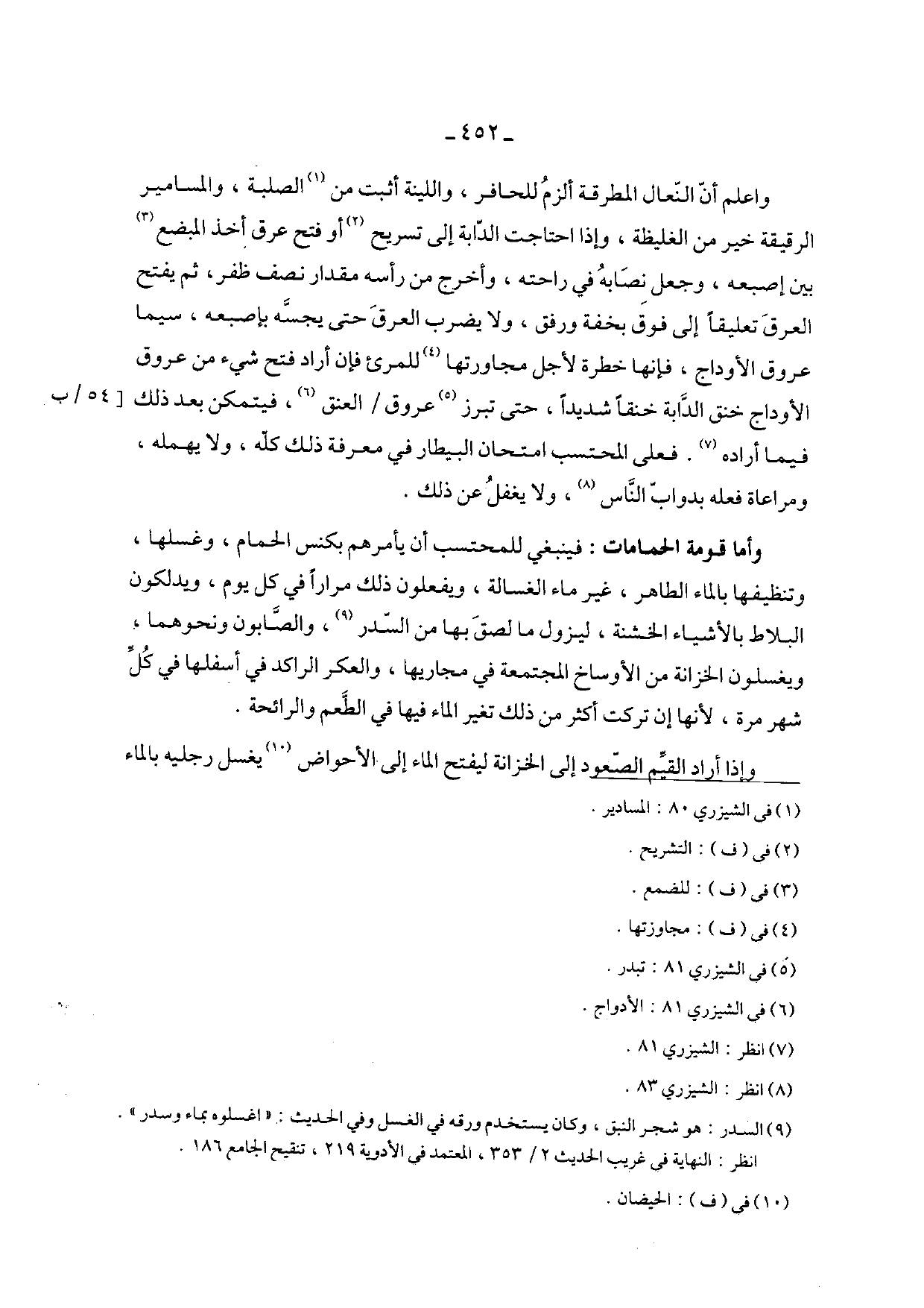 والعم أن النعال المطرقة ألزم للحافر، واللينة أثبت من الصلبة، والمسامير الرقيقة خير من الغليظة، وإذا احتاجت الدابة إلى تسريح أو فتح عرق أخذ المبضع بين إصبعه، وجعل نصابه في راحته، وأخرج من رأسه مقدار نصف ظفر، ثم يفتح العرق تعليقاً إلى فوق بخفة ورفق، ولا يضرب العرق حتى يحبسه بإصبعه، سيما عروق الأوداج، فإنها خطرة لأجل مجاورتها للمرئ فإن أراد فتح شيء من عروق الأوداج خنق الدابة خنقاً شديداً، حتى تبرز عروق / العنق، فيتمكن بعد ذلك فيما أراده. فعلى المحتسب امتحان البيطار في معرفة ذلك كله، ولا يهمله، ومراعاة فعله بدواب الناس، ولا يغفل عن ذلك.